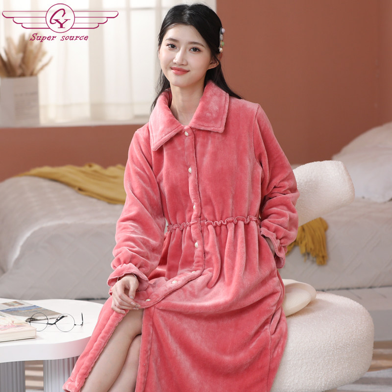 French coral fleece nightgown women's autumn and winter thickened long version bathrobe pajamas sweet princess flannel retro nightdress