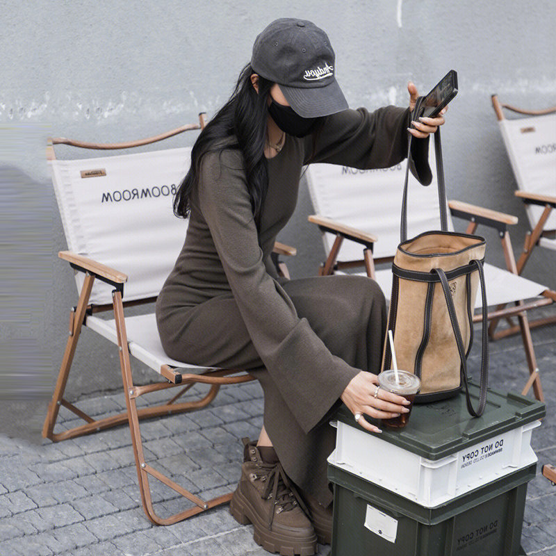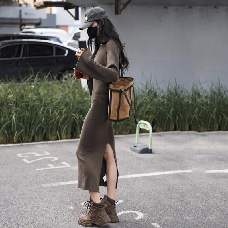 Advanced senses unique and lean casual Hepburn style long sleeves knit long style bag hip dress woman fall-Taobao