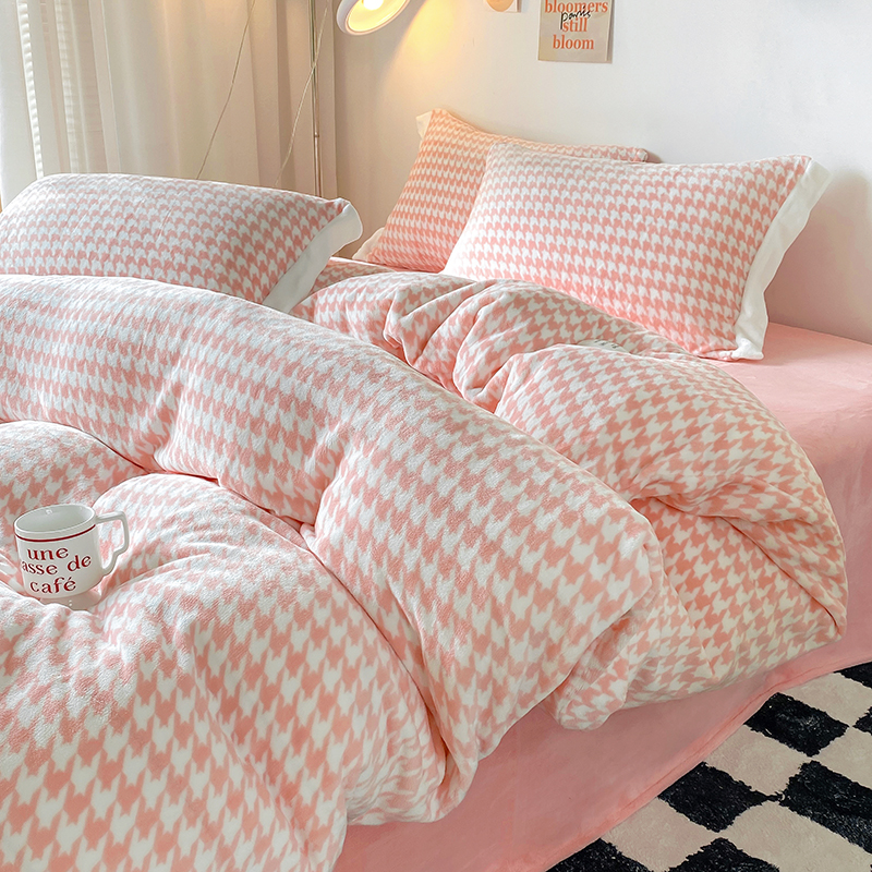 Wide-brimmed milk velvet bed four-piece checkerboard thickened plus velvet bed sheet houndstooth coral fleece warm quilt cover