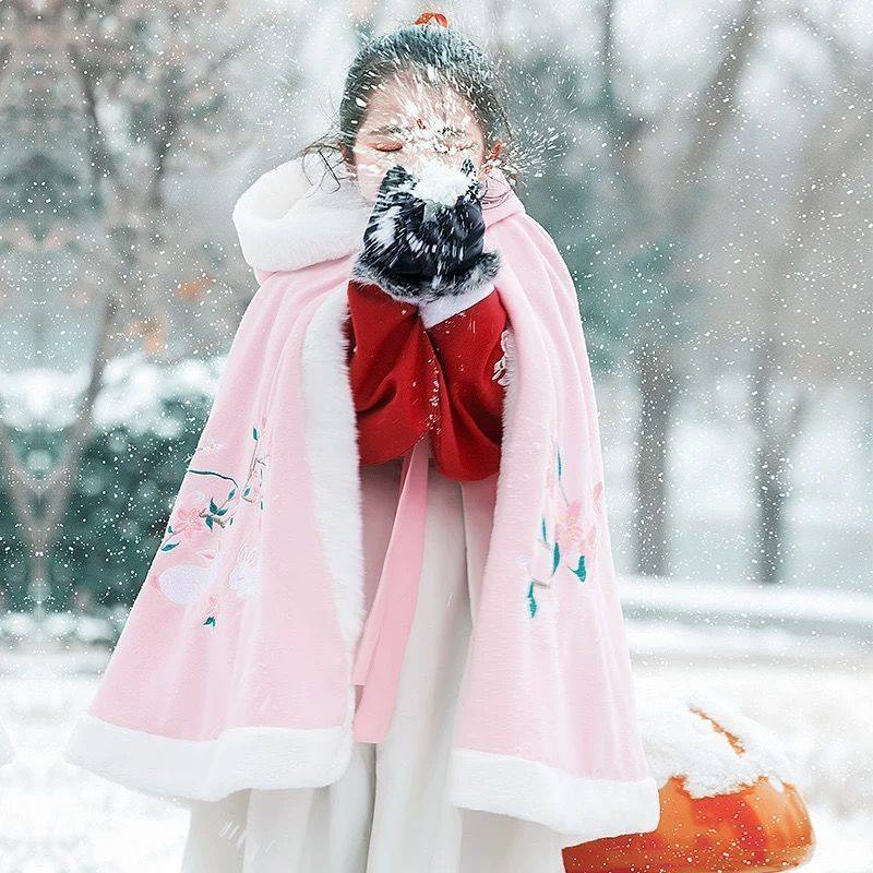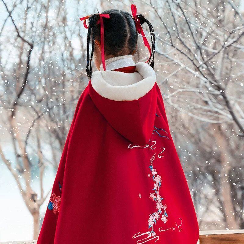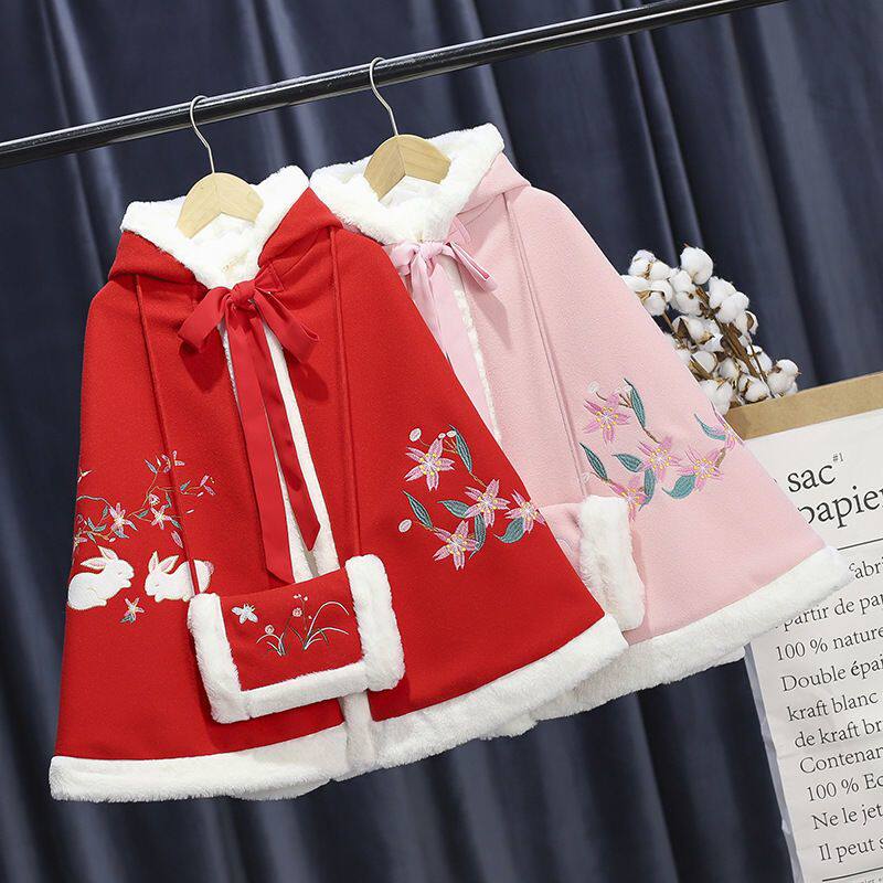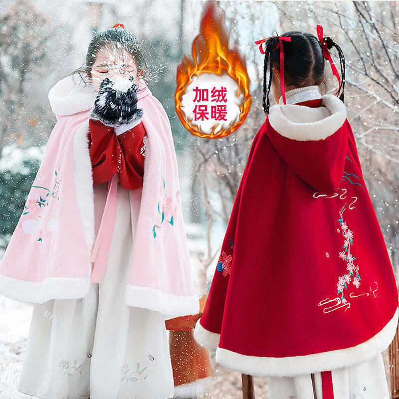 Child plus fleece Thickened Cape China Wind Girl Princess Shawl Warm Windproof Jacket Baby Hanfu Winter-Taobao