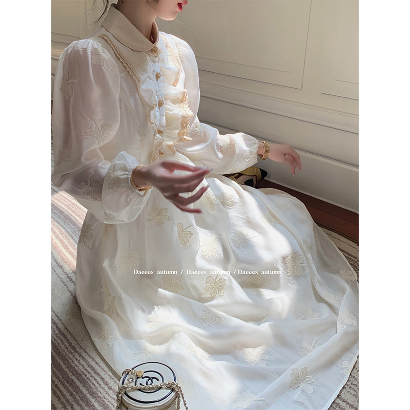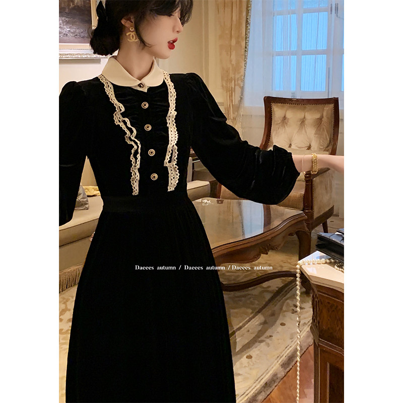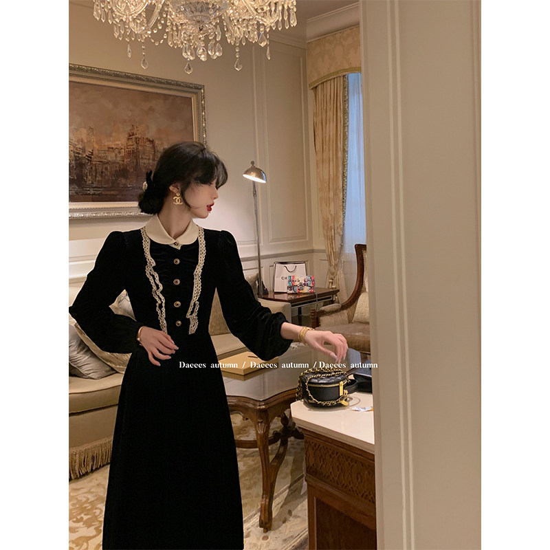 Great Eees Poetry Encounters Autumn Boat Lace dolls collar Hepburn Breeze Little Black Dress Long Sleeves Silk Suede Dress Fall New-Taobao