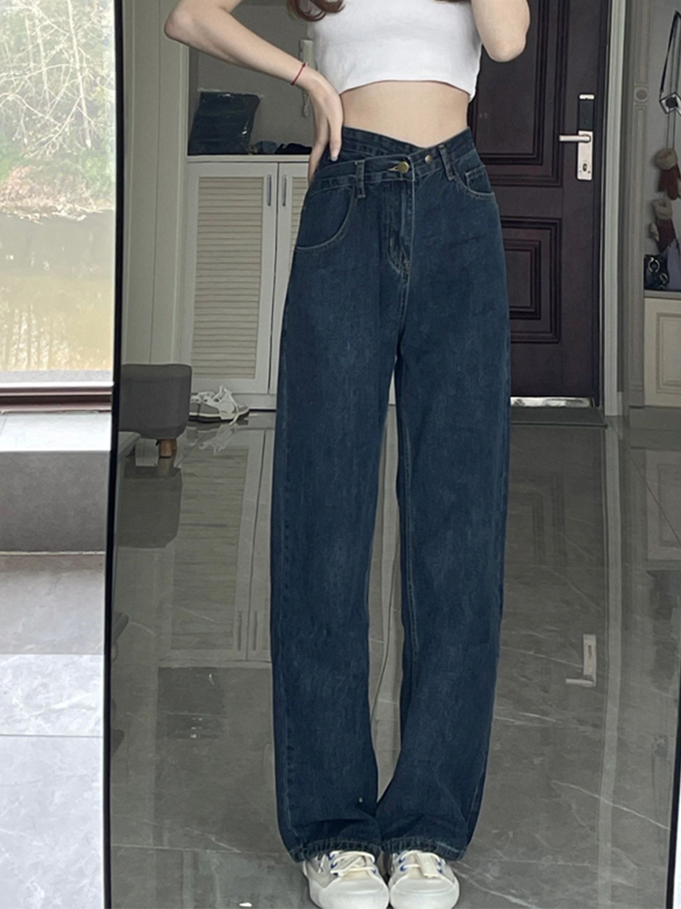 Pear-shaped stature broadlegged jeans Women's summer new fat mm irregular design sensation High waist display slim fit straight tube long pants-Taobao