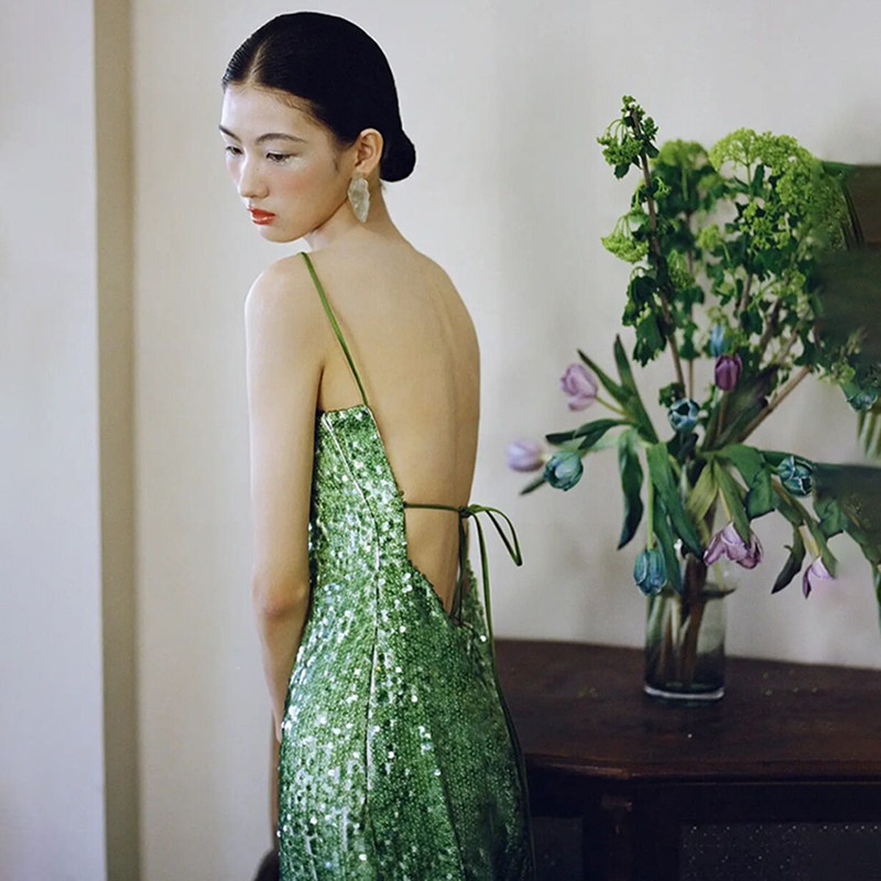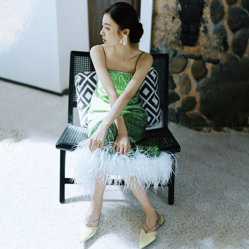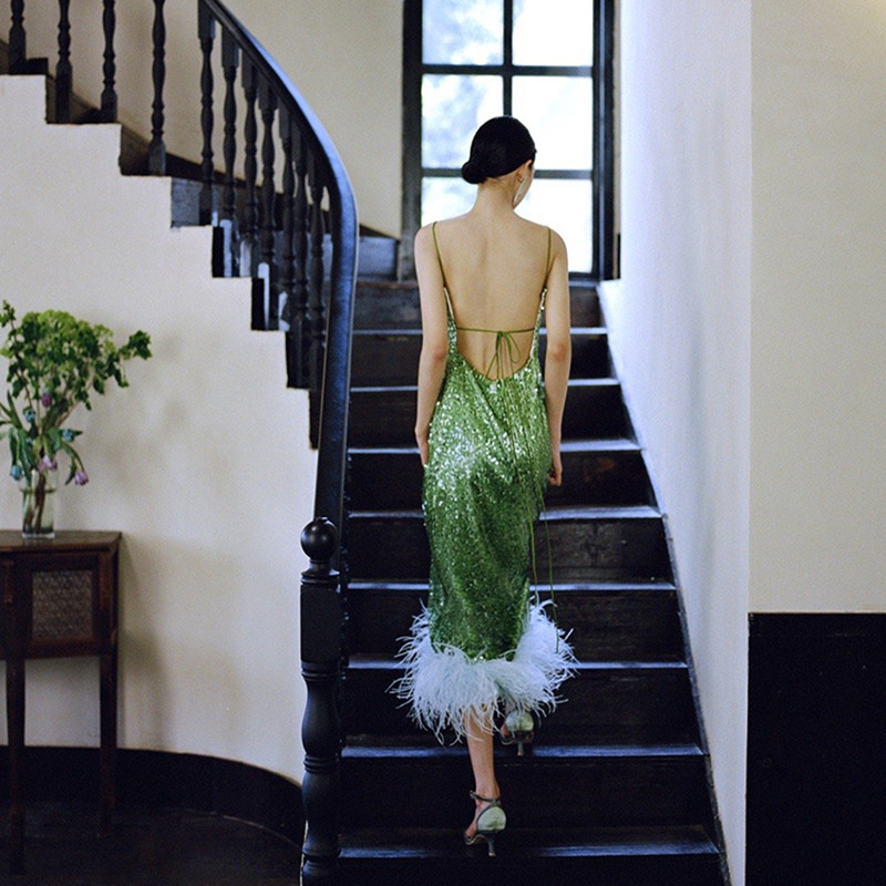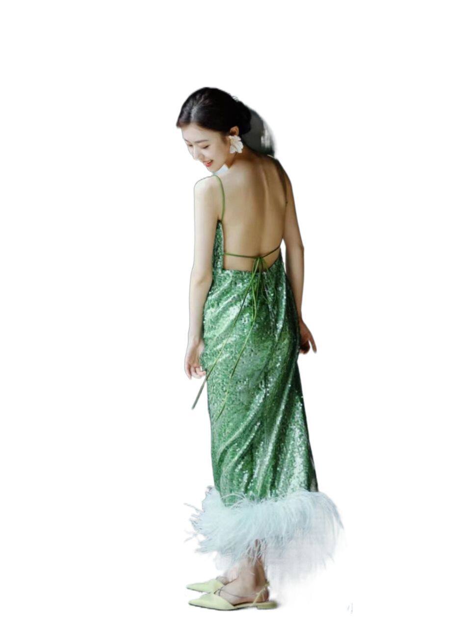 Niche retro lotus leaf green bridal morning gown Chinese style engagement sequin dress wedding senior ostrich feather toast clothing