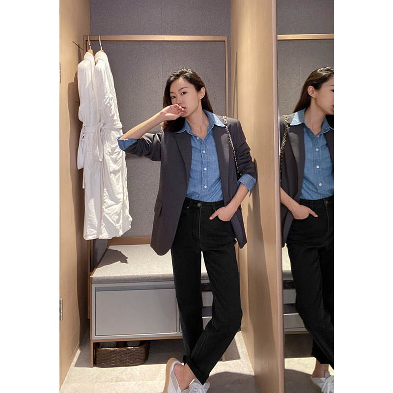Mudge's shop is trendy out of the street. Retro raw-edged straight cropped jeans show long legs