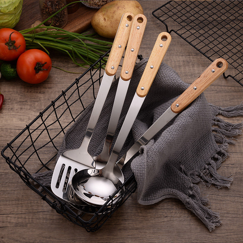 12 colander with three-nail wooden handle, soup spoon with three-nail wooden handle, frying shovel with three-nail wooden handle