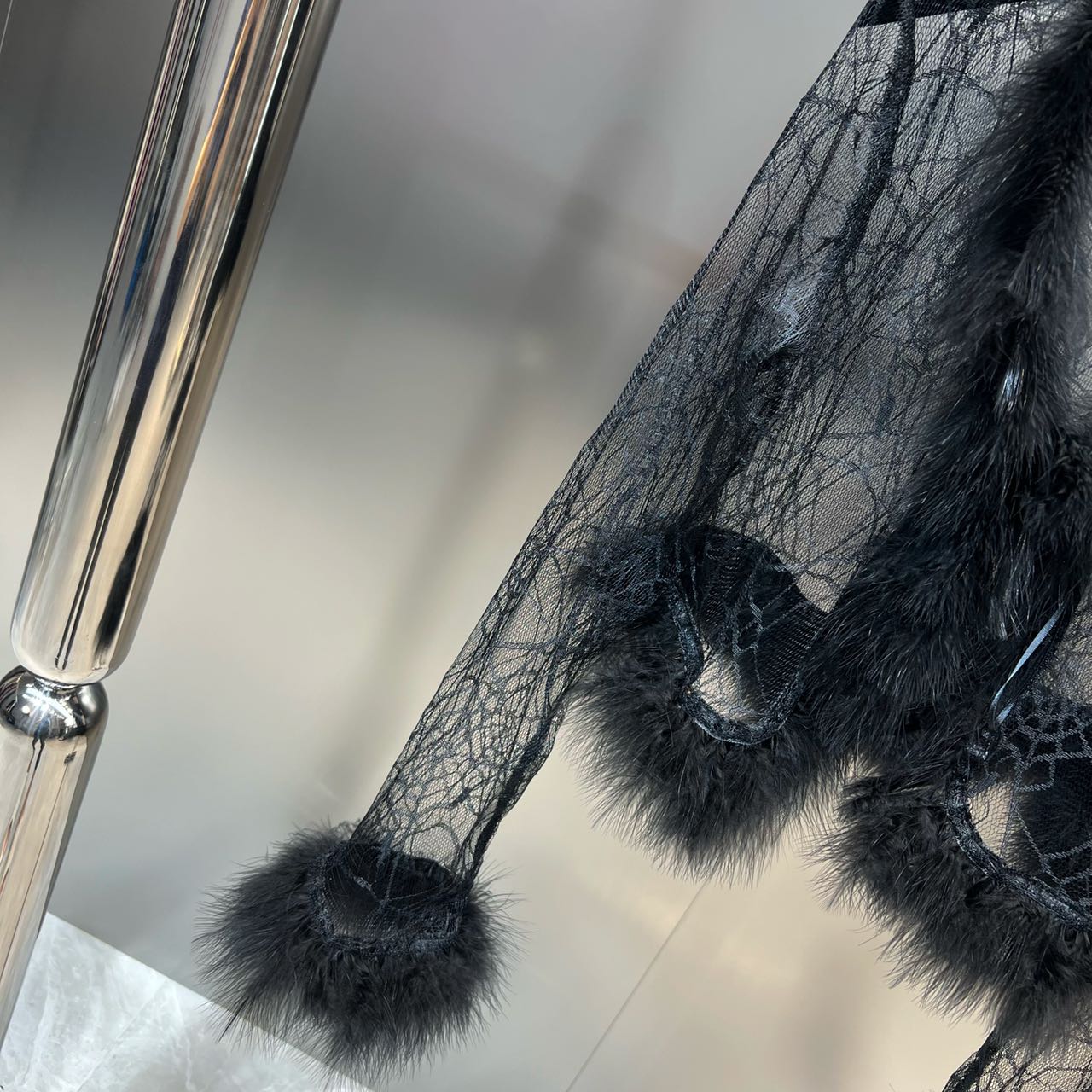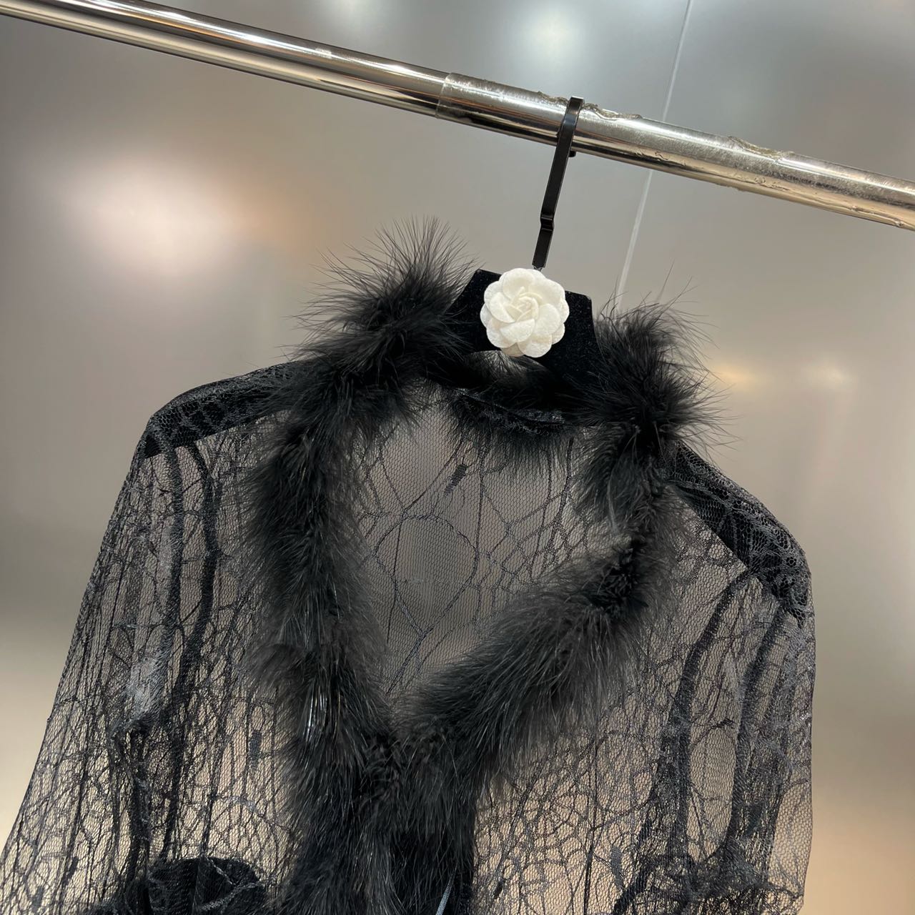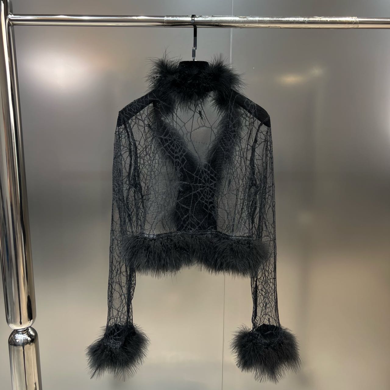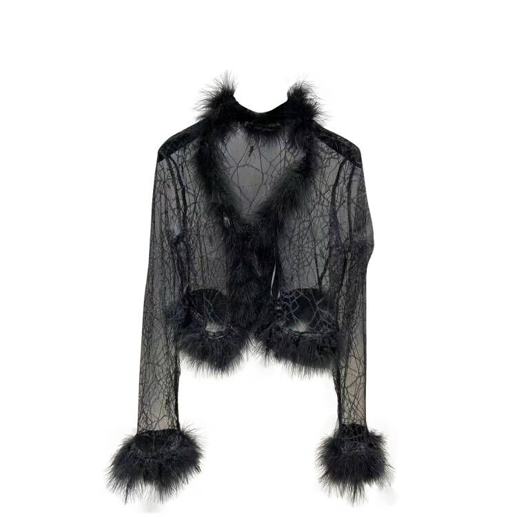 Grapefruit MM 2022 Fall V - collar ostrich hair spider web pattern perspective veil sweater coat