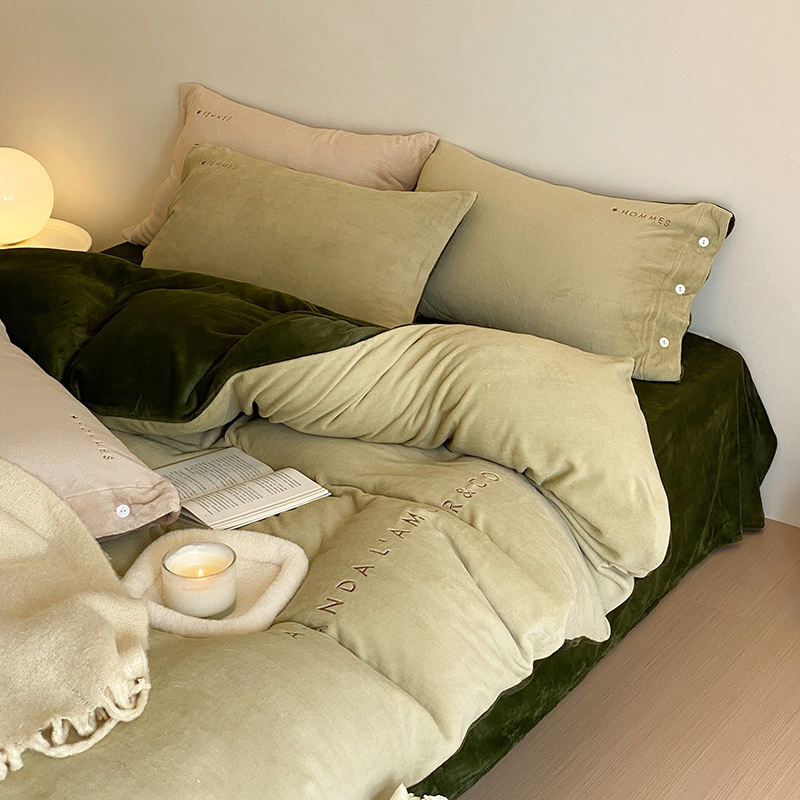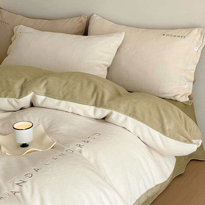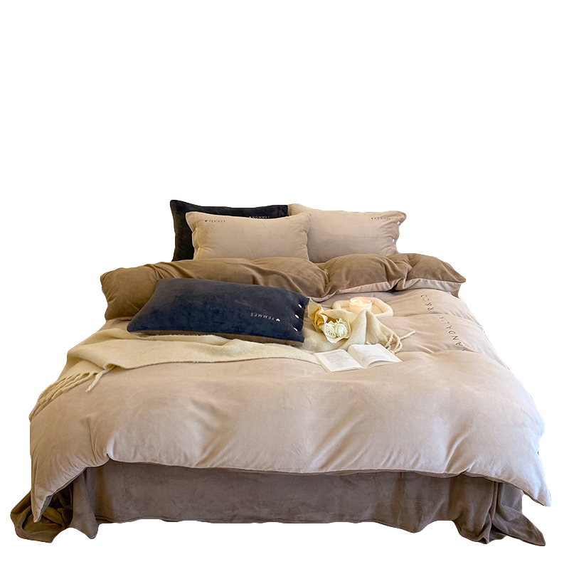 ins pure color embroidered milk suede four pieces of winter warm coral suede three 4 pieces of covered flannel bed linen quilt cover-Taobao