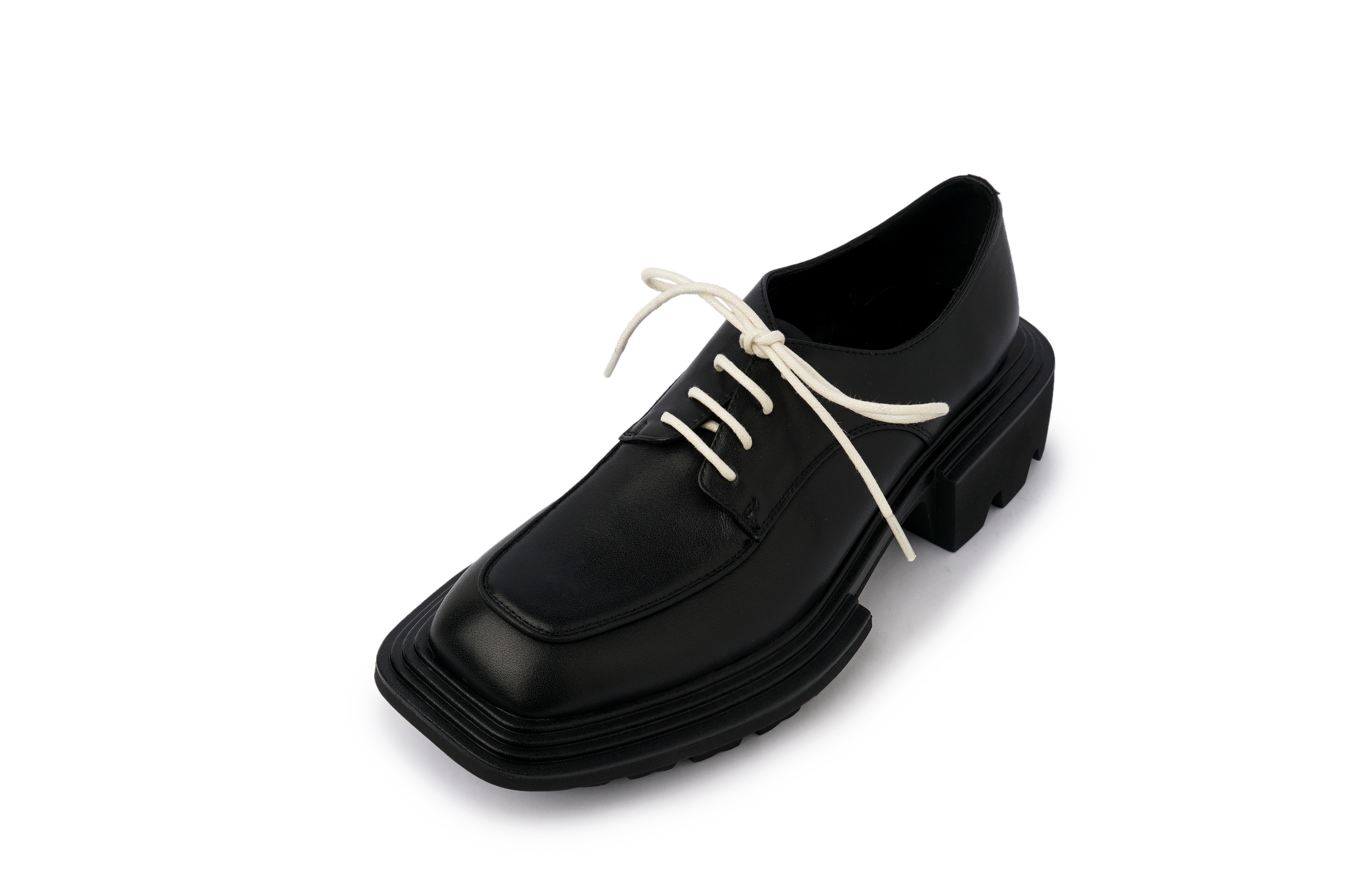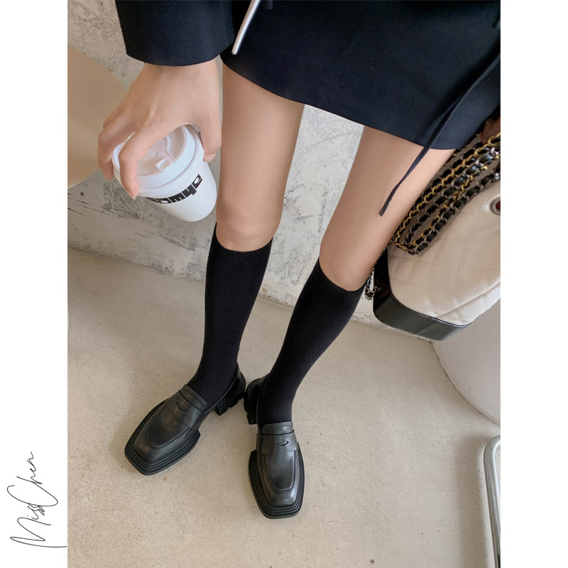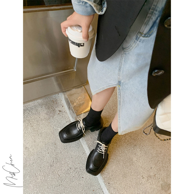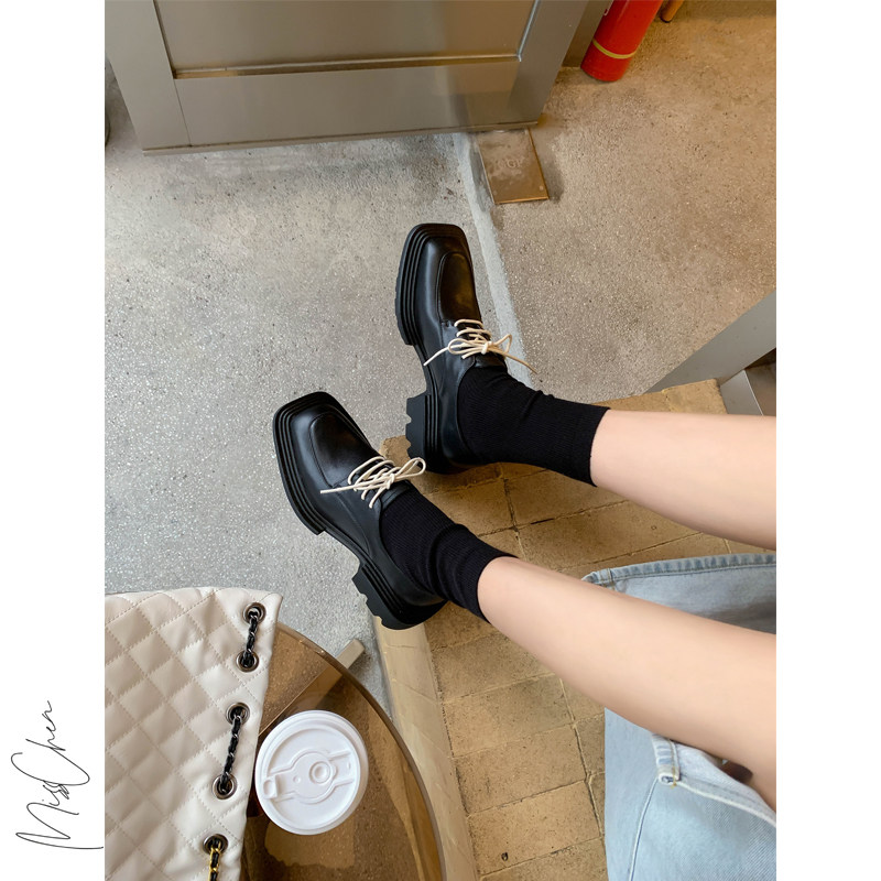 (Miss Chen) Cool~ Solid color thick sole heightened lace-up plain loafers ultra-light medium thick heel single shoes for women