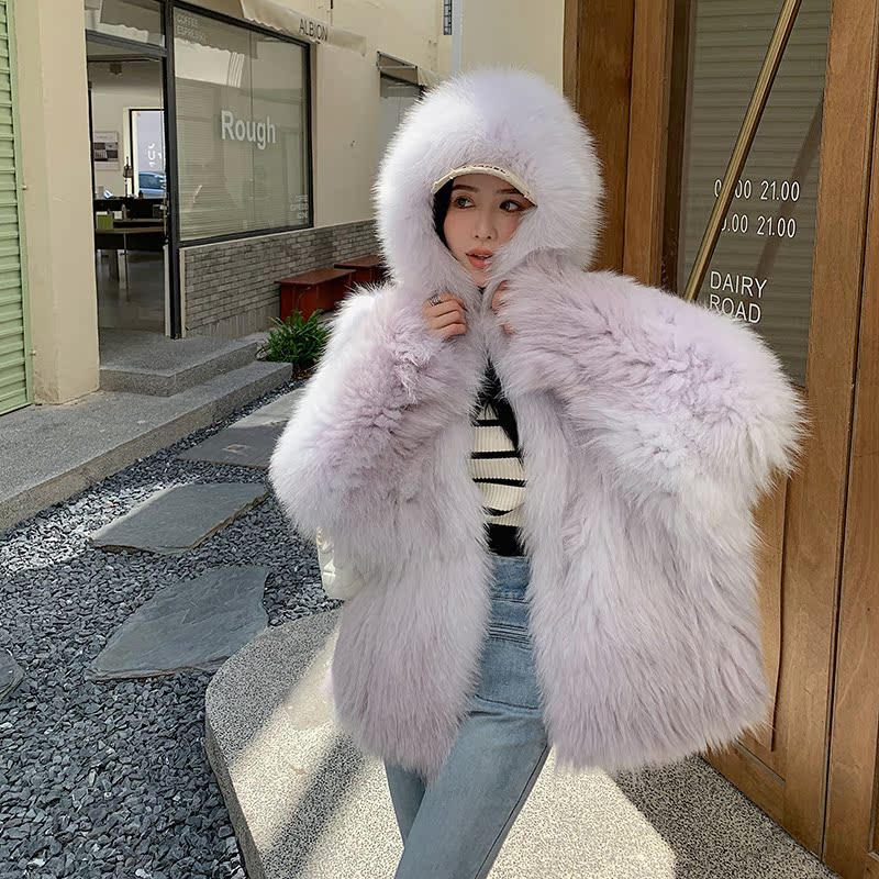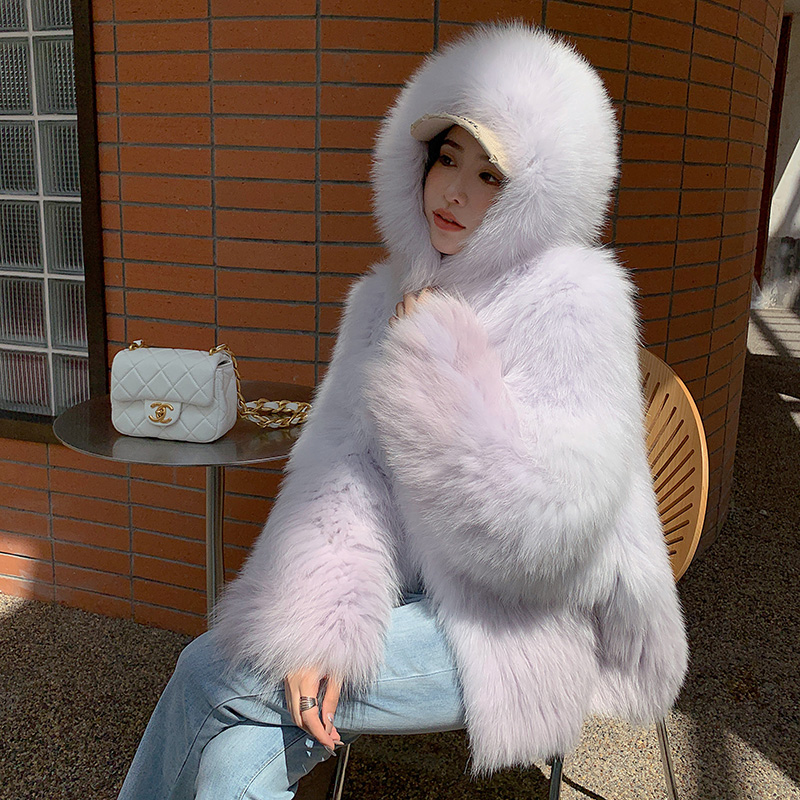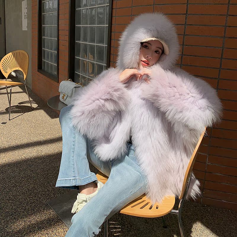 2022 Winter New Haining Fur Jacket Female Fox Fur Double-sided Woven Sweet Hood Contrasting Color Big Pyrenees - Taobao