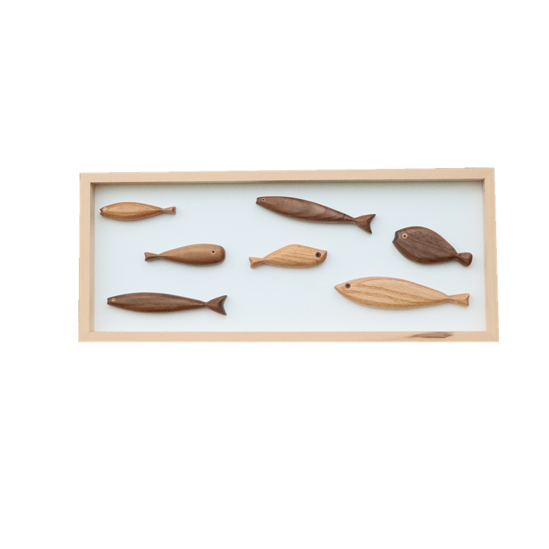 Beech frame log fish hanging picture (7 fish in one frame) 2 solid lotus leaves (red oak and black walnut) single fish (can be used as refrigerator stickers)