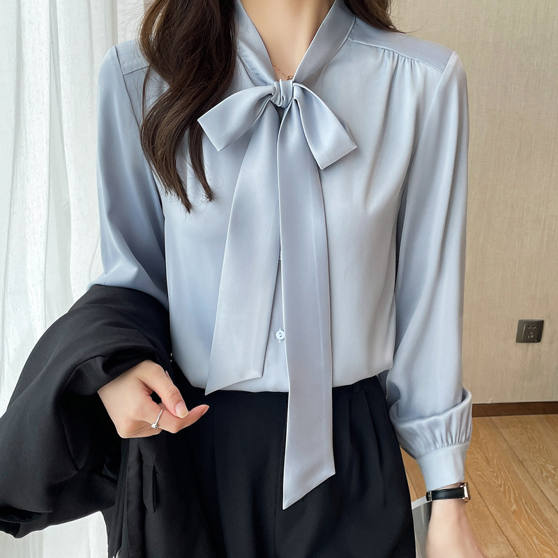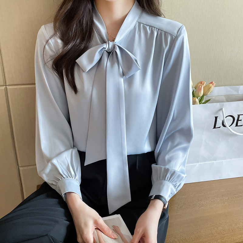 JOLIMENT blue chiffon shirt women's bow ribbon 2022 autumn new loose and thin long-sleeved top