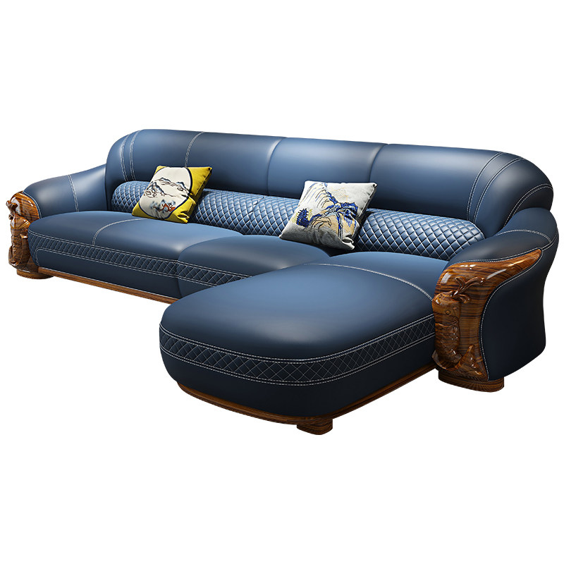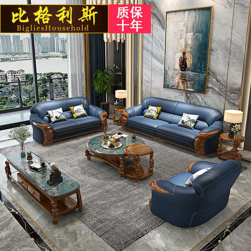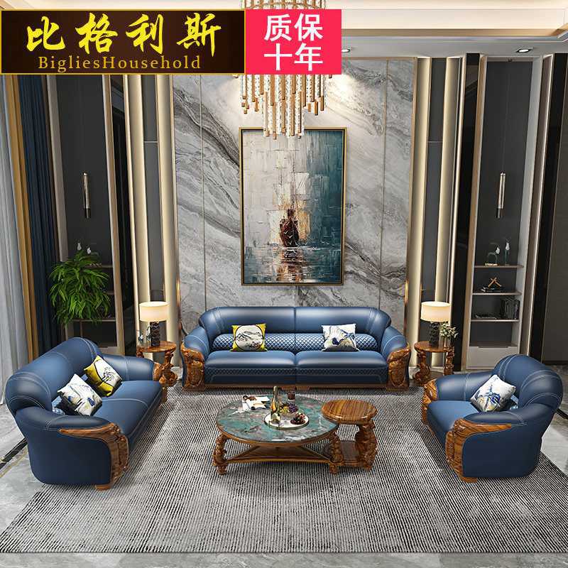 Light lavish golden wood real leather sofa 124 Composition Living room minimalist Eurostyle Wind Villa Solid Wood Carp Carved furniture-Taobao