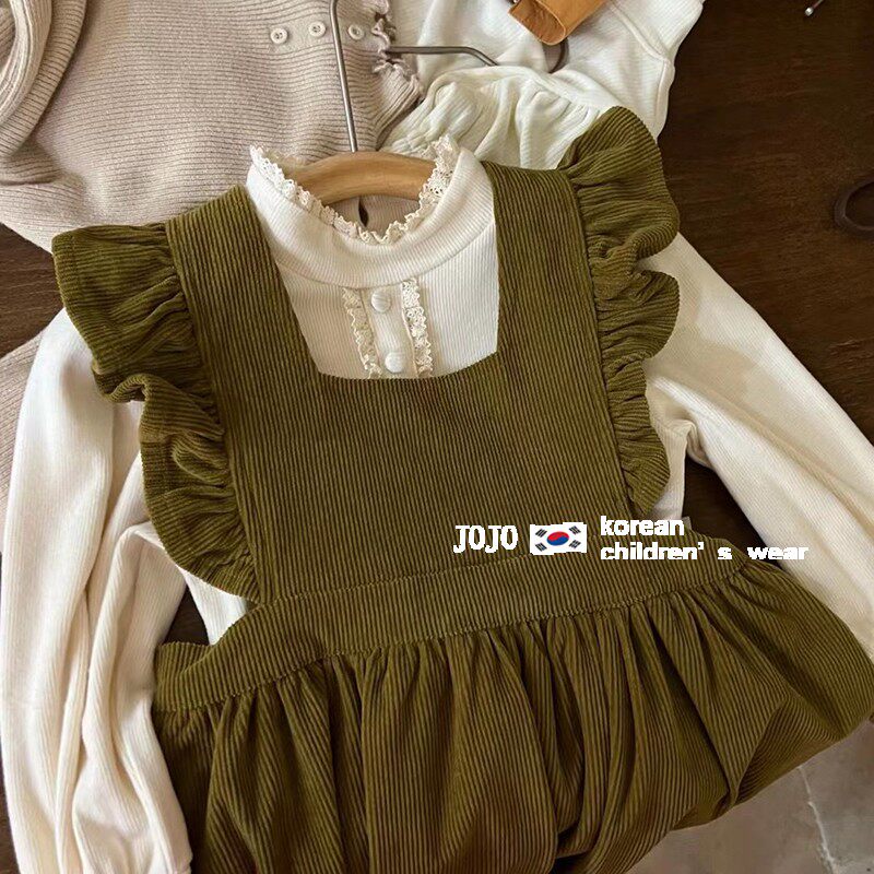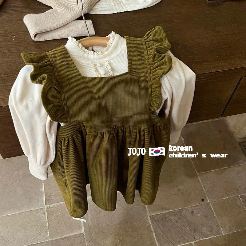 Korean version girl 2024 autumn winter new lamp core suede one-piece dress baby green retro harness skirt trendy princess dress-Taobao