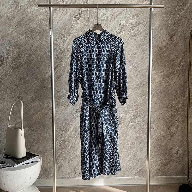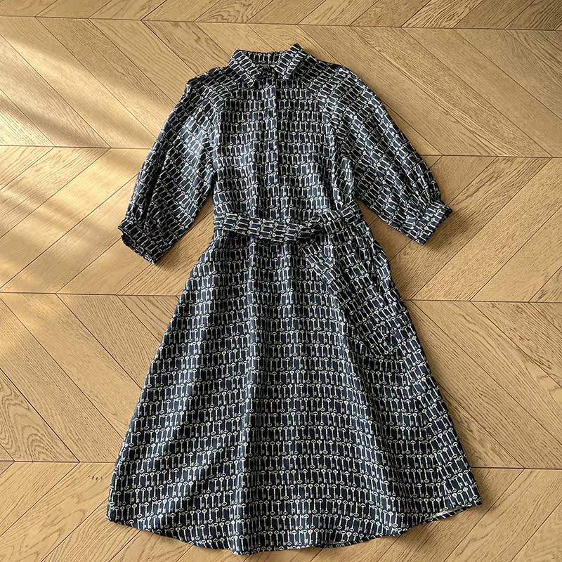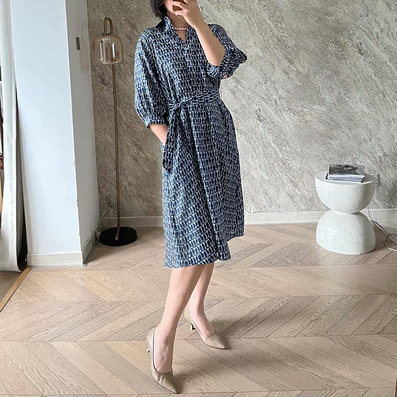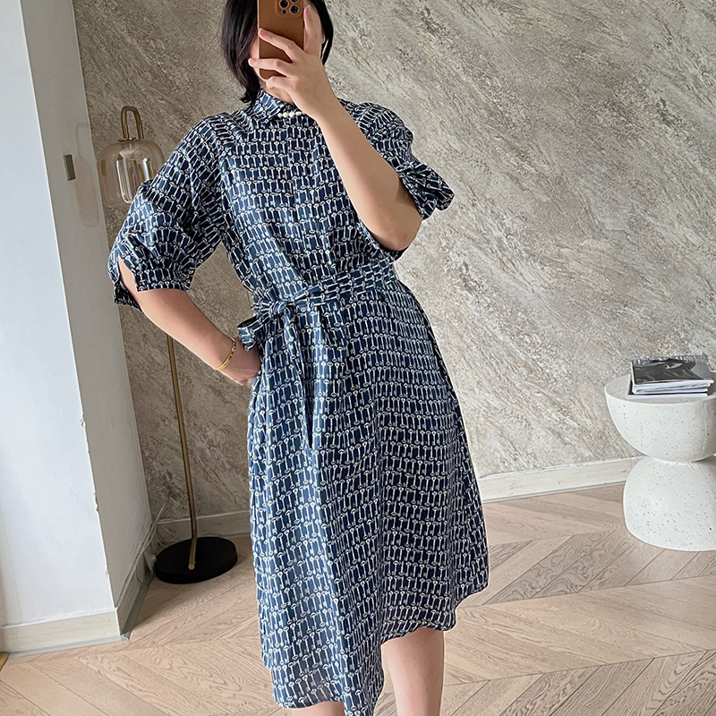 Elegant and playful dark blue key printed with silk sloping silk lantern sleeve shirt dress 0807D1