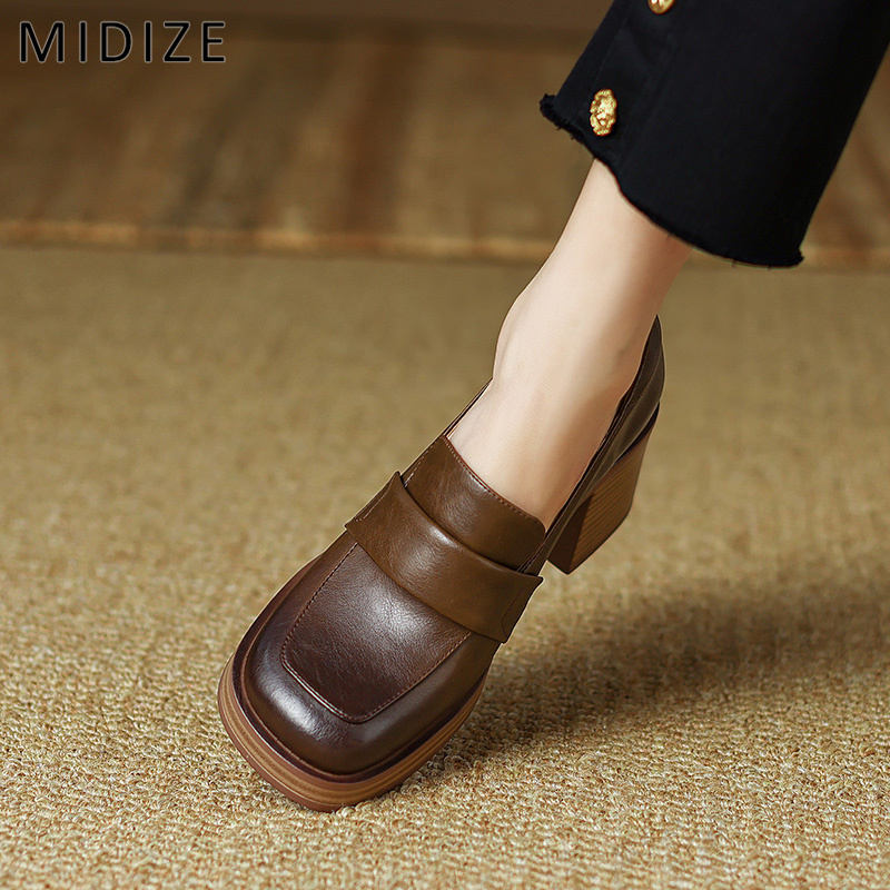 MIDIZE loafers women's retro style shoes women's 2022 new bag shoes square toe thick heels brown high heels