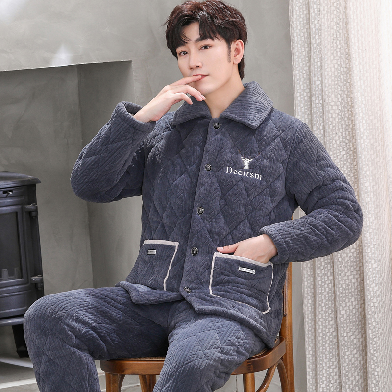 Pyjamas Men's winter gushed thickened three-layer clip cotton flannel suede jacket Coral Suede Warm Autumn Winter-Taobao