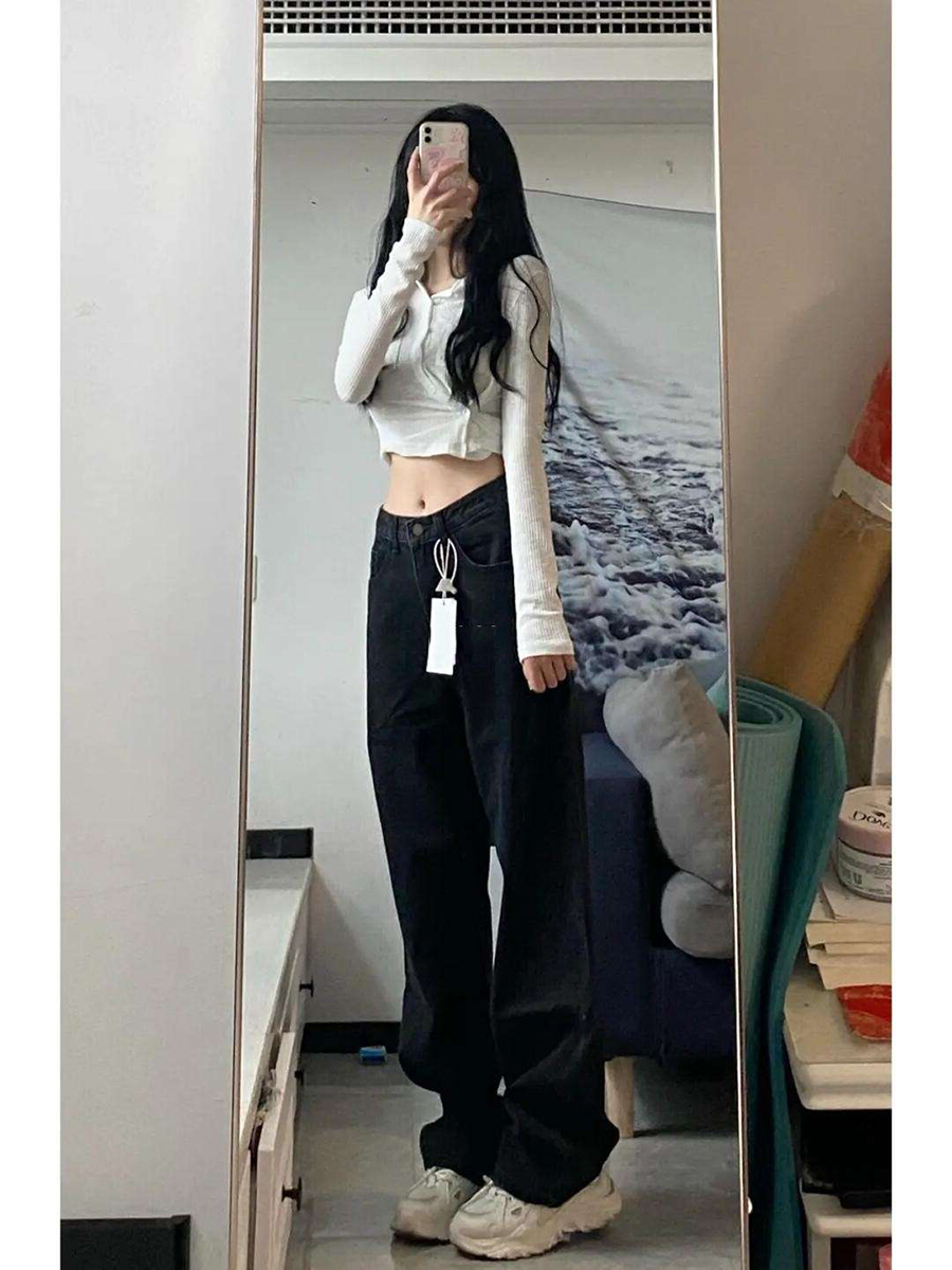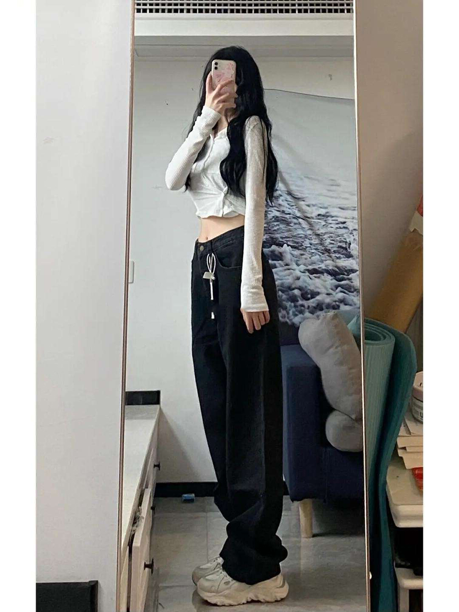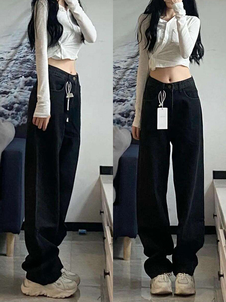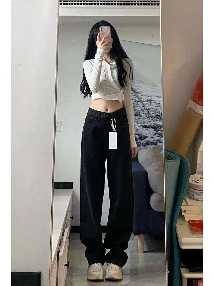High waist jeans Women's straight cylinder loose autumn and winter large size Fat Mm Pear-shaped Stature Black Plus Suede Pants-Taobao