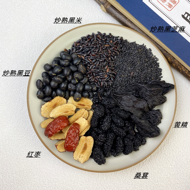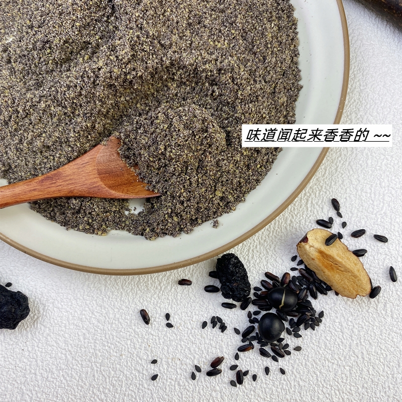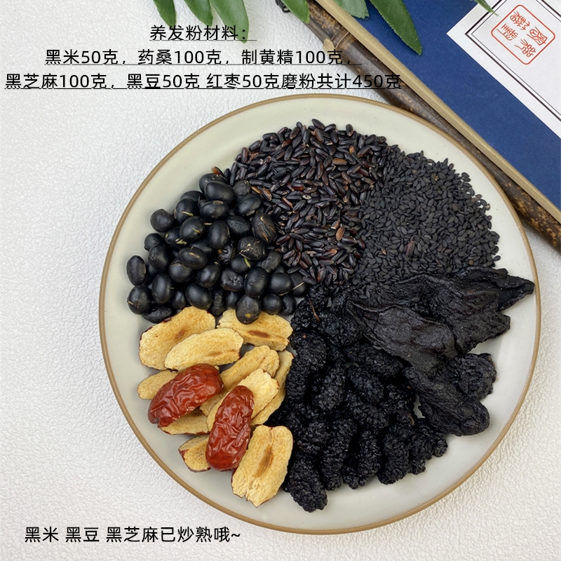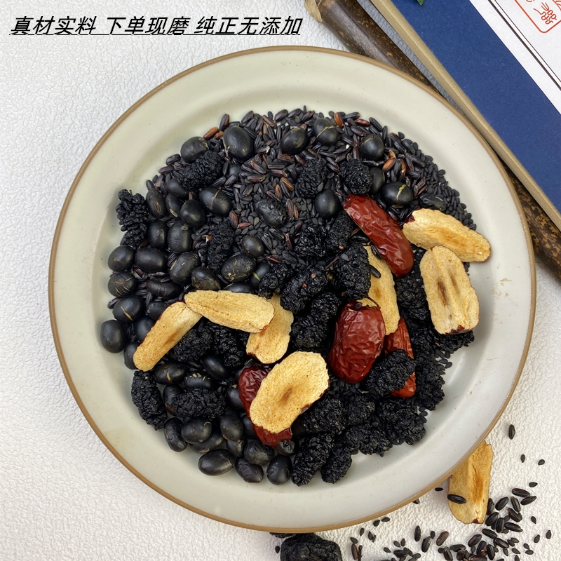 Hair-raising powder, black rice, medicine, mulberry, Huangjing, black sesame, black beans, red dates, combination mulberry, freshly ground raw materials, cooked powder, soaked in water