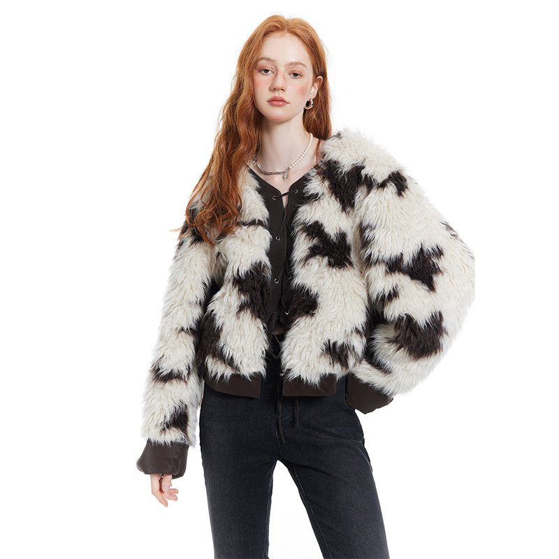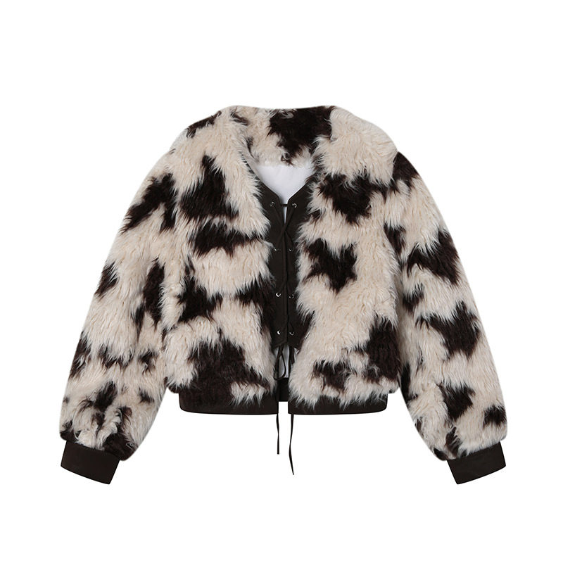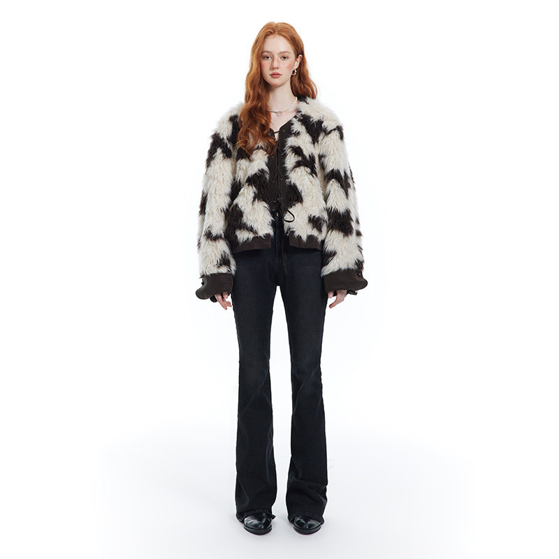 Les Fortes 22AW Original Brown Cow Pattern Plush Patch Leather Coat Lace Design High-Level Fur