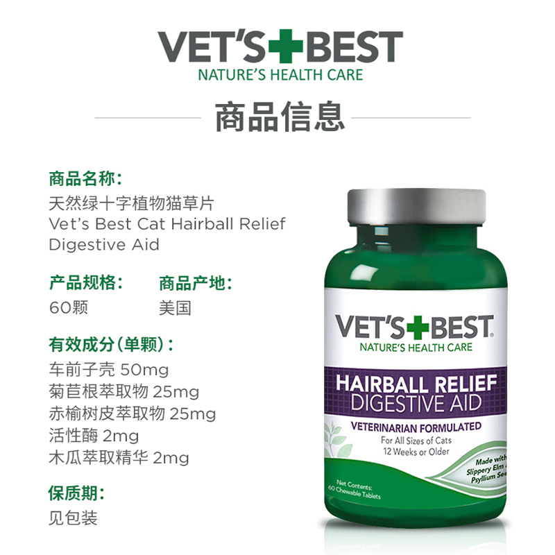 VETS BEST U.S. Green Cross Cat Grass Tablets Cat Hair Pills Remove Hair Balls to Help Digest and Regulate Stomach 60 Capsules