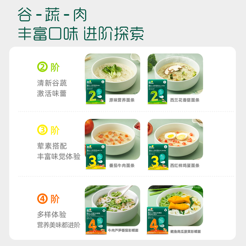2 order classic original 2 order broccoli mushroom taste 3 order tomato beef taste 3 order tomato egg taste 4 order beef asparagus tomato taste 4 order cod pumpkin spinach taste 4 order fun small noodles 2 order original granules