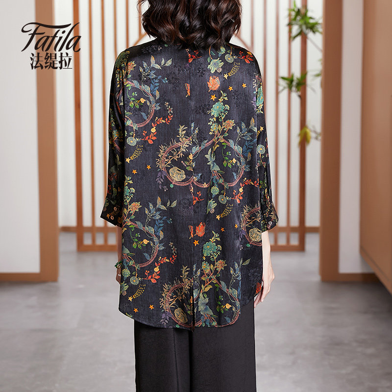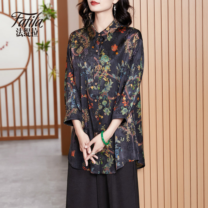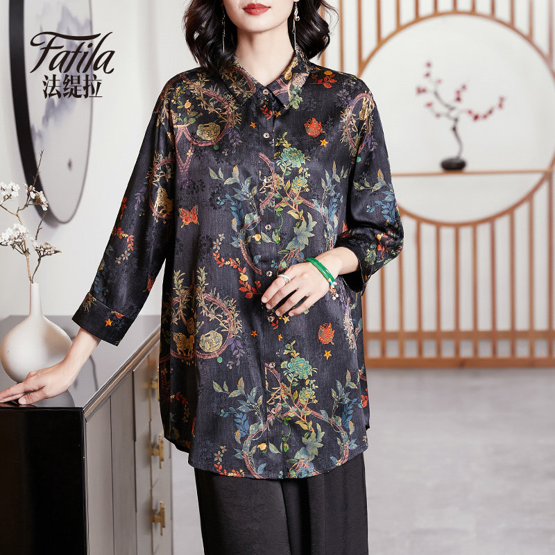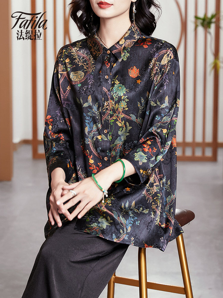 Middle-aged mother silk shirt woman long sleeve new loose printed satin sauna silk topper