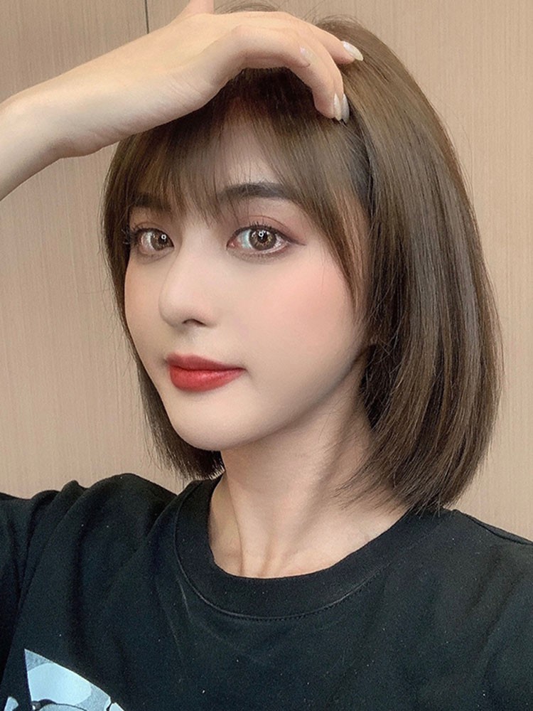 Wig short hair female frivolous bangs Bobo head full real hair medium and long bobo head net red round face full headgear
