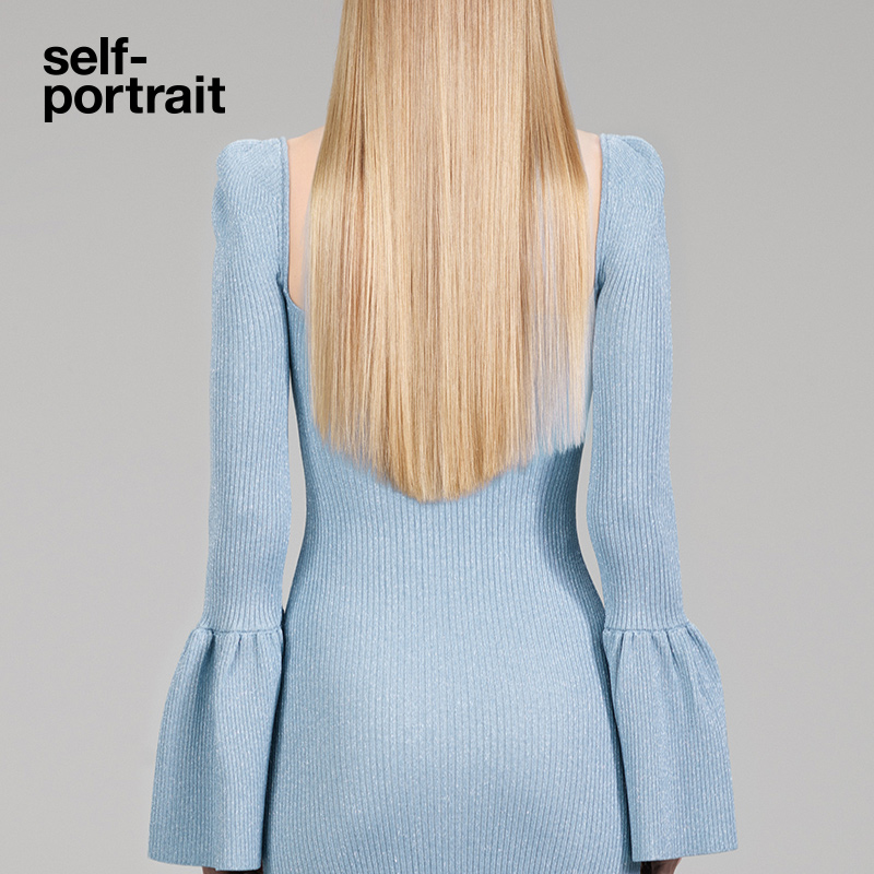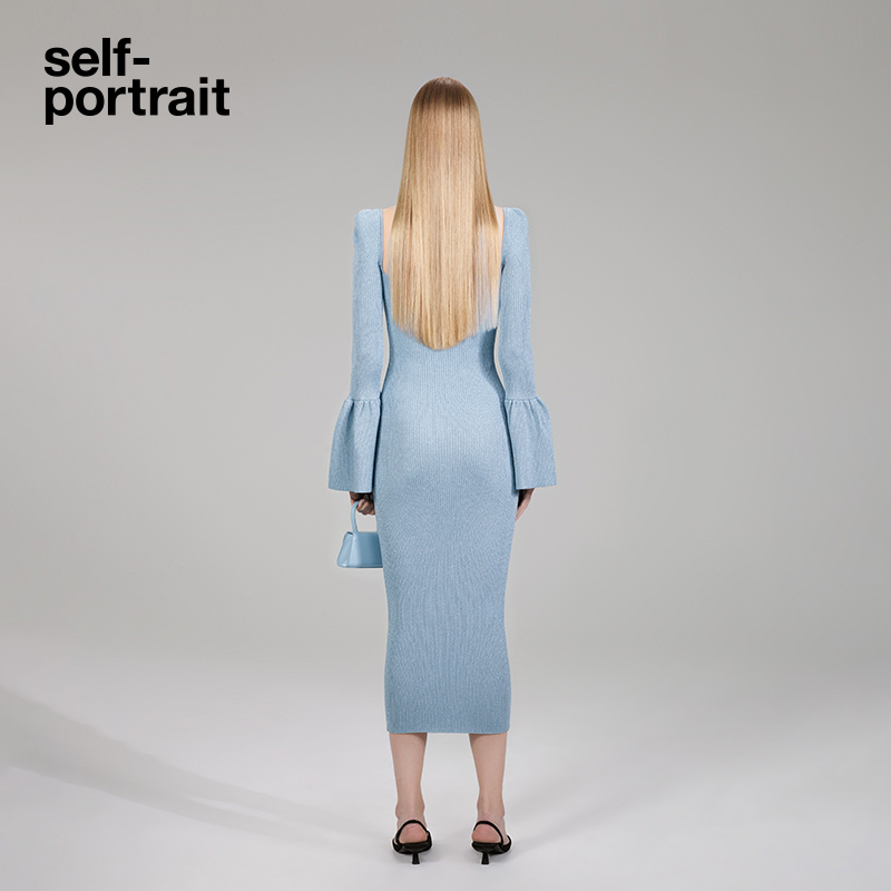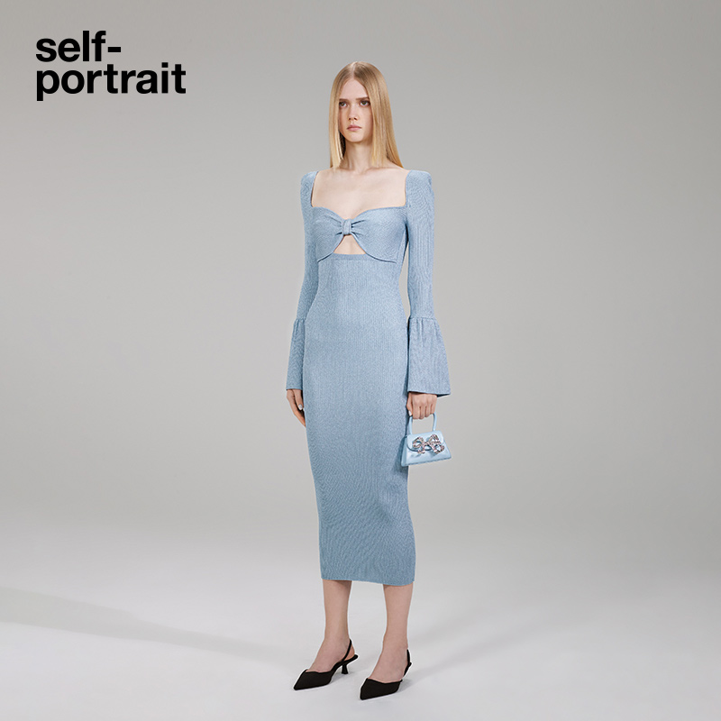 self-portrait 2022 autumn/winter misty blue square neck flared sleeve bow casual dress