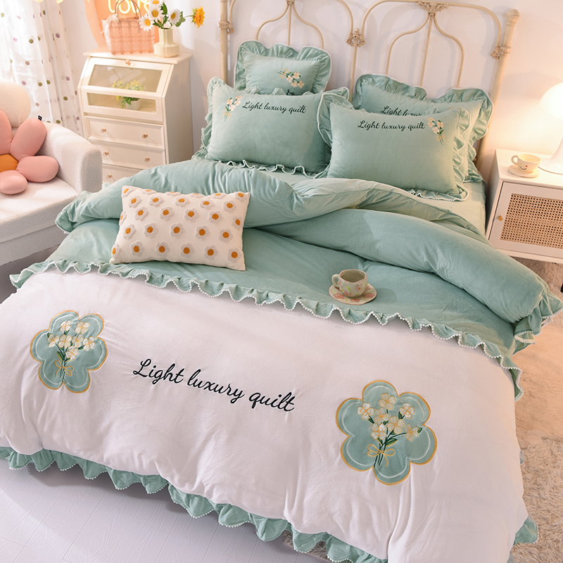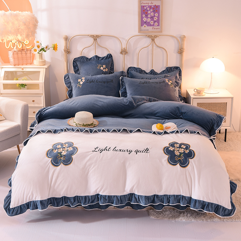 Little fairy style embroidery milk velvet four-piece princess crystal velvet bed skirt winter plus velvet bed sheet quilt cover thickened