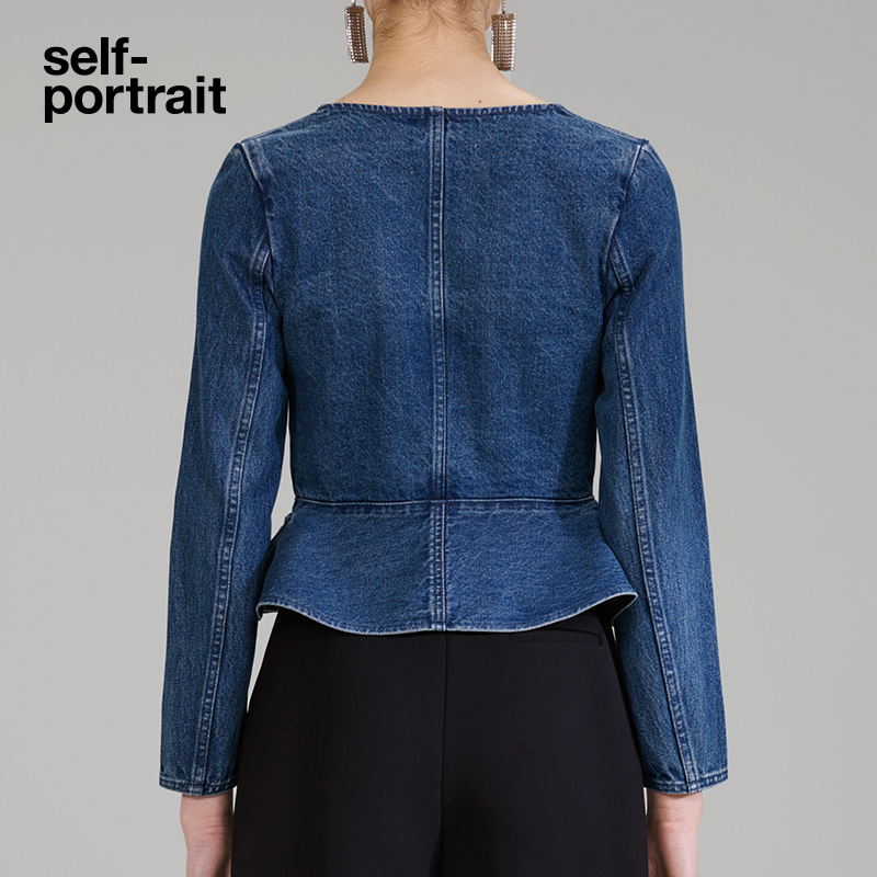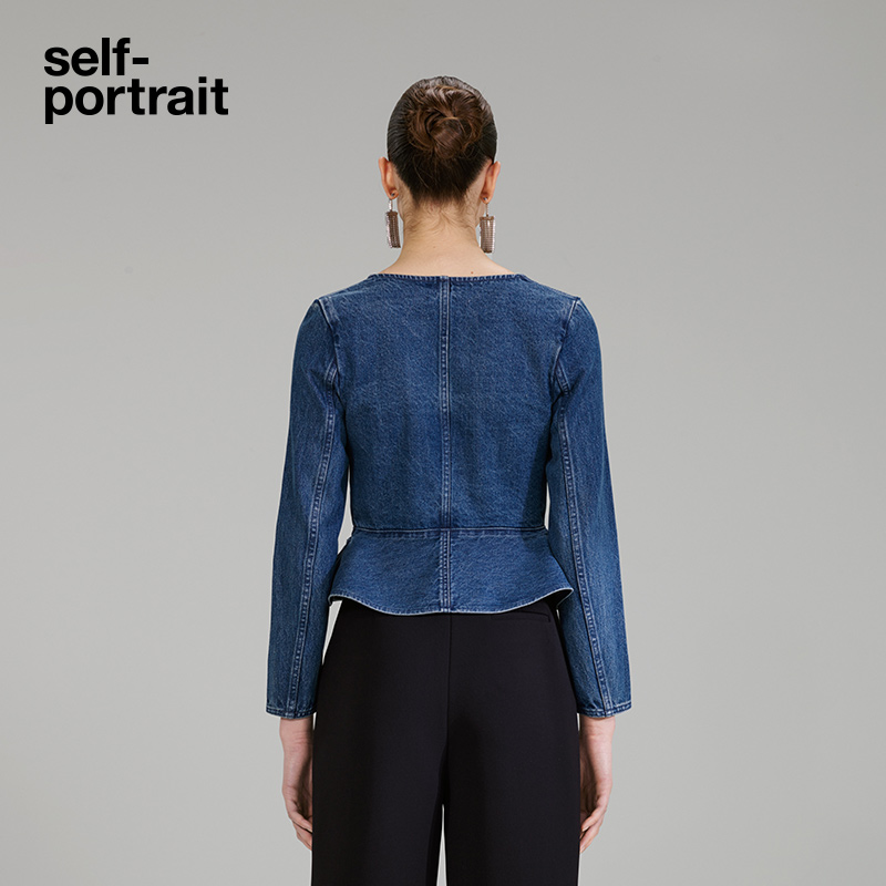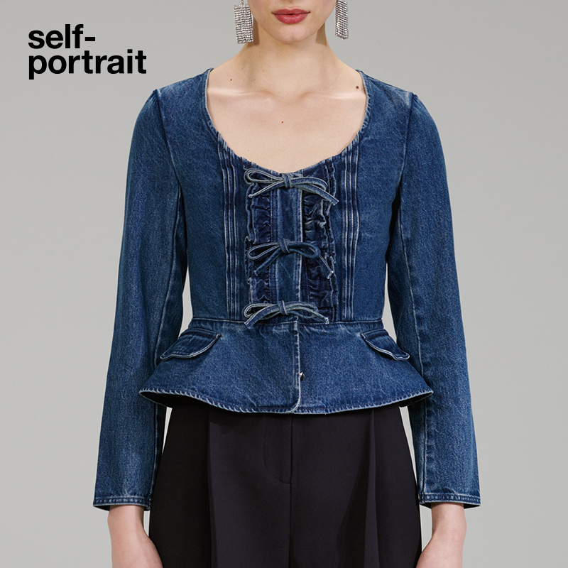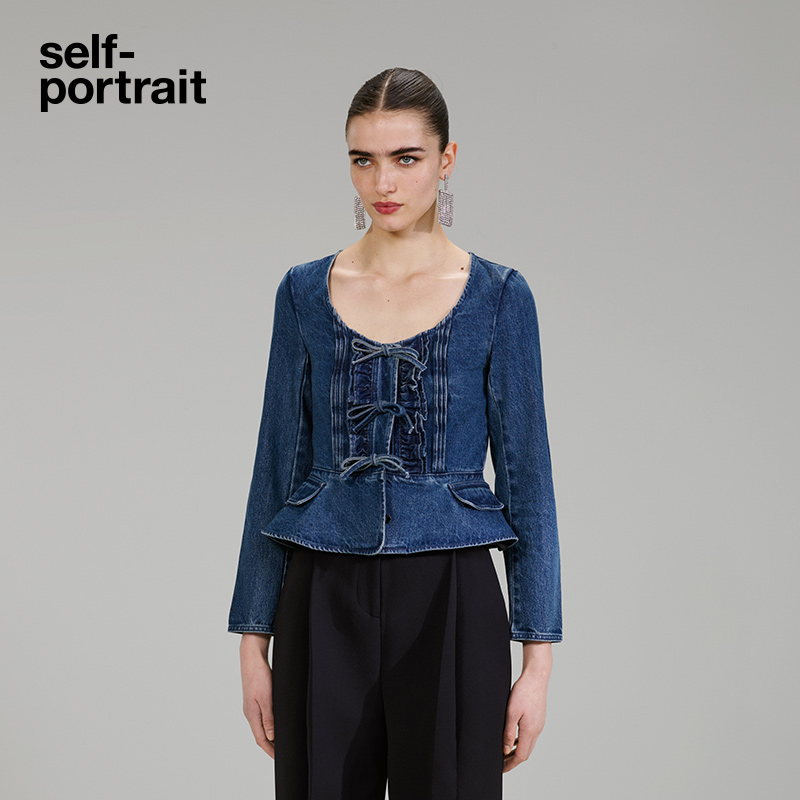 self-portrait 2022 autumn and winter denim blue bow round neck waist top