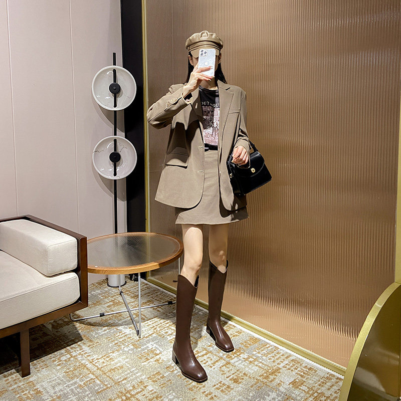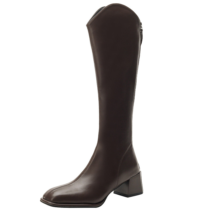 2023 new elastic square head coarse heel V mouth long cylinder boot female rear zipper display slim but knee high cylinder rider long boot-Taobao