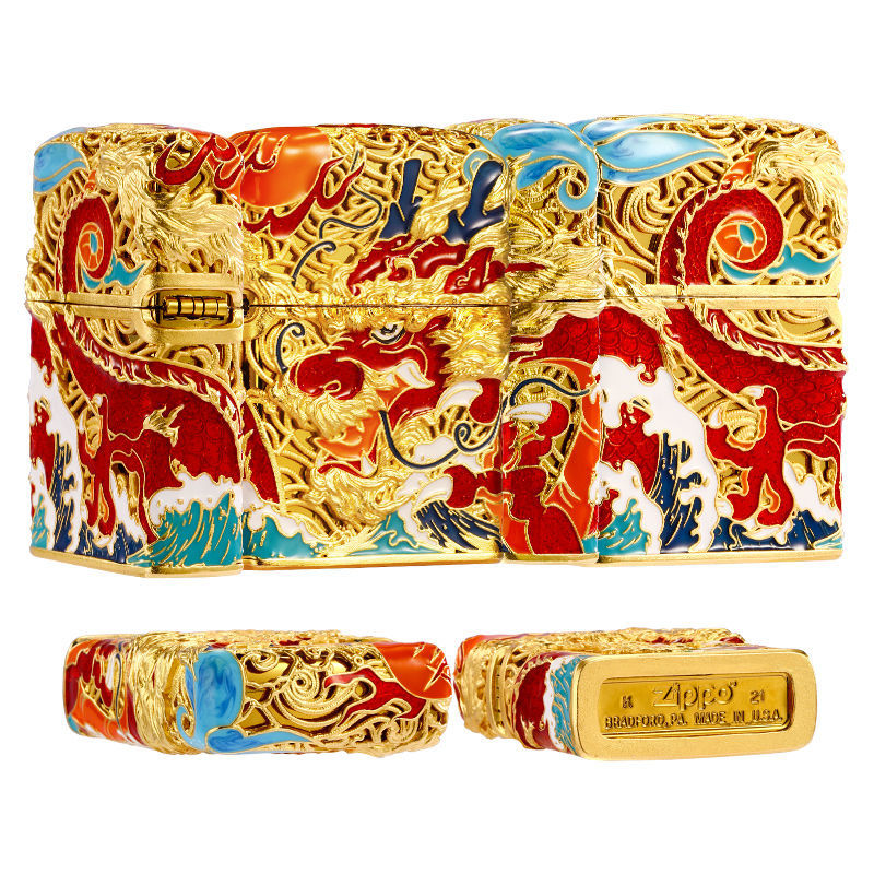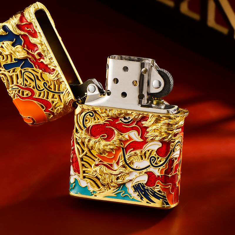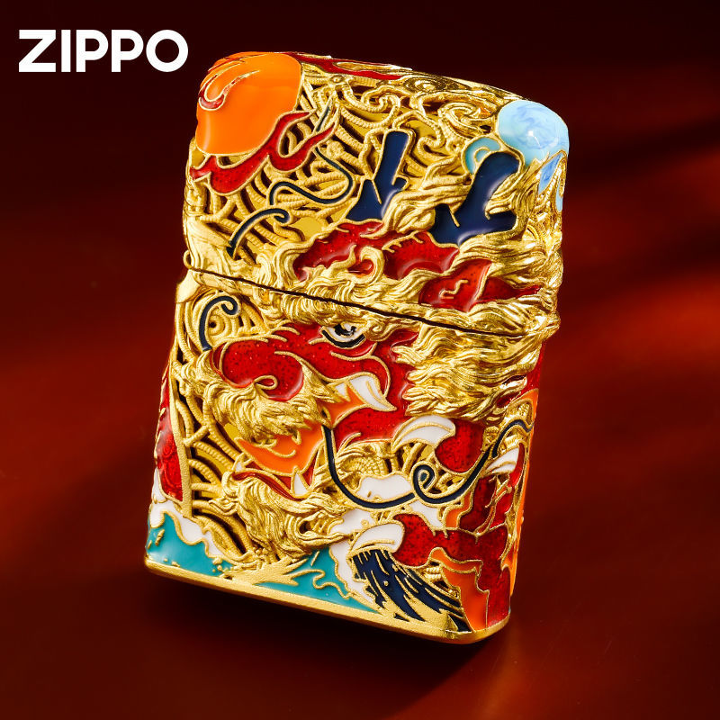 Zippo lighter Longteng four sea copper plated gold filament enamel coloured wind kerosene chipset crystal box