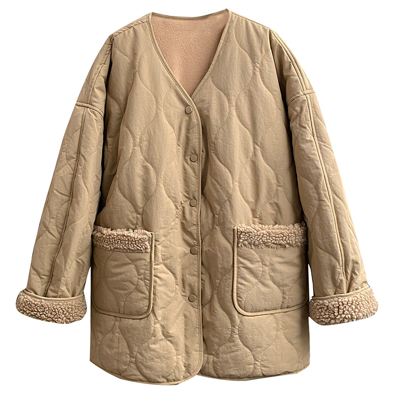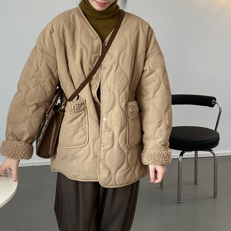 2023 Winter V collar splicing lamb wool down cotton clothing jacket women cotton coated cotton padded jacket Korean version pure color blouses-Taobao