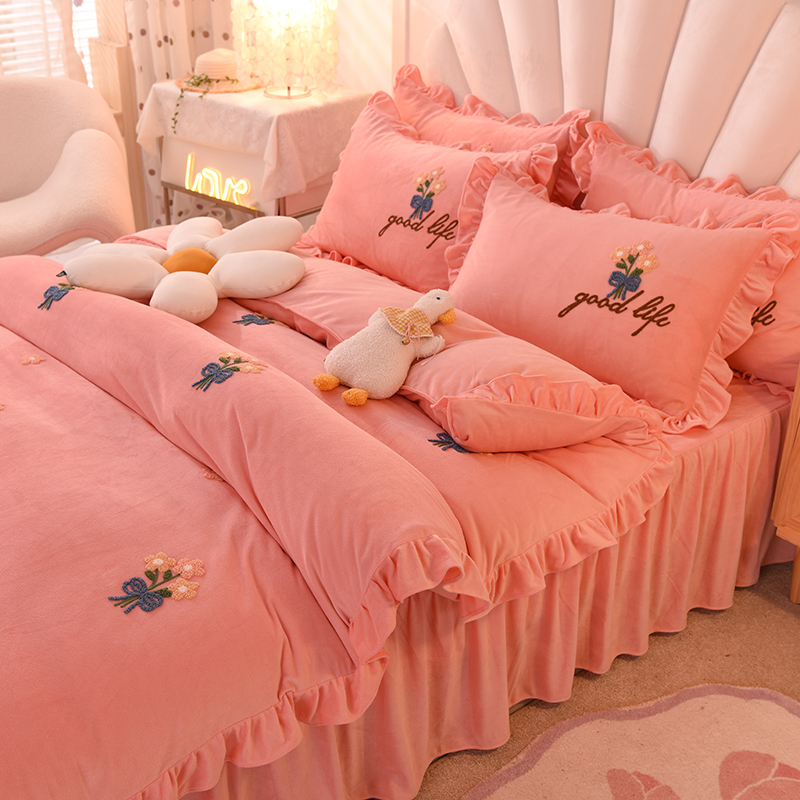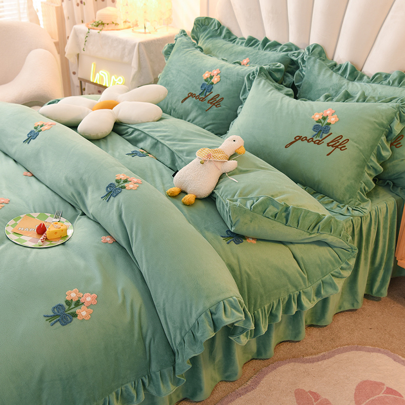 Korean version towel embroidered crystal velvet four-piece autumn and winter small fresh and thickened milk velvet bed skirt quilt cover double-sided velvet sheets