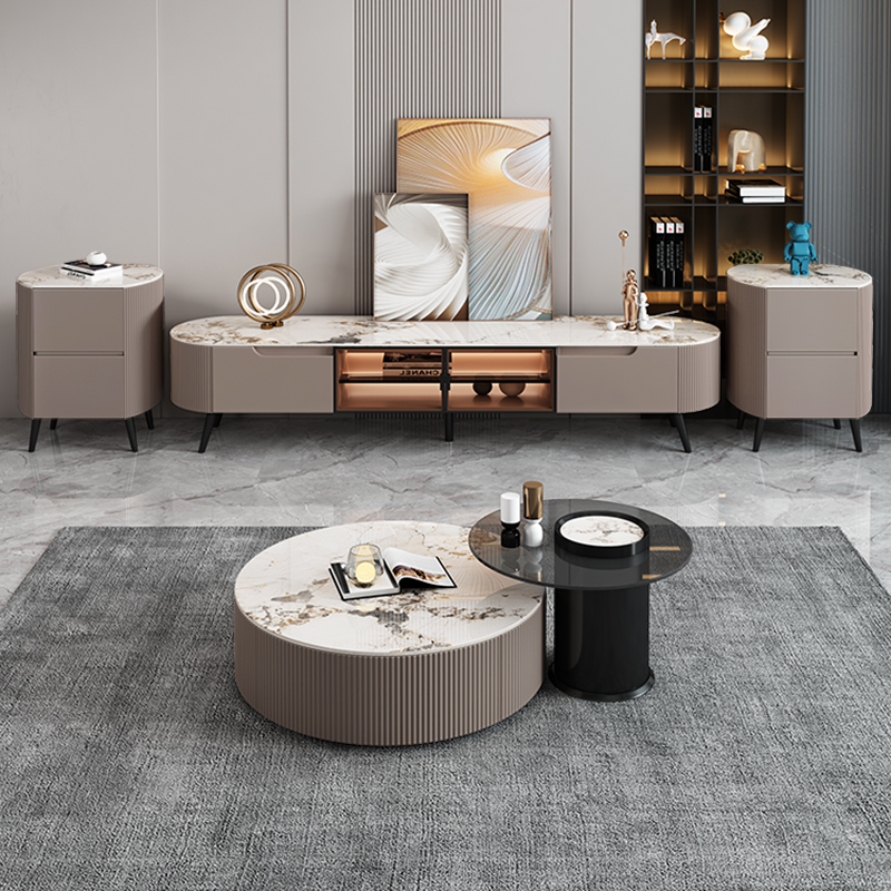 Modern minimalist light luxury slate TV cabinet tea table combination new small apartment living room round Nordic storage floor cabinet