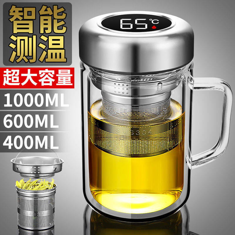 Large-capacity double-layer glass with handle tea water separation tea making office men and women intelligent temperature measuring water cup