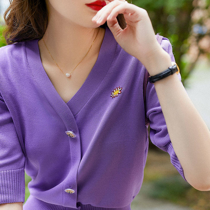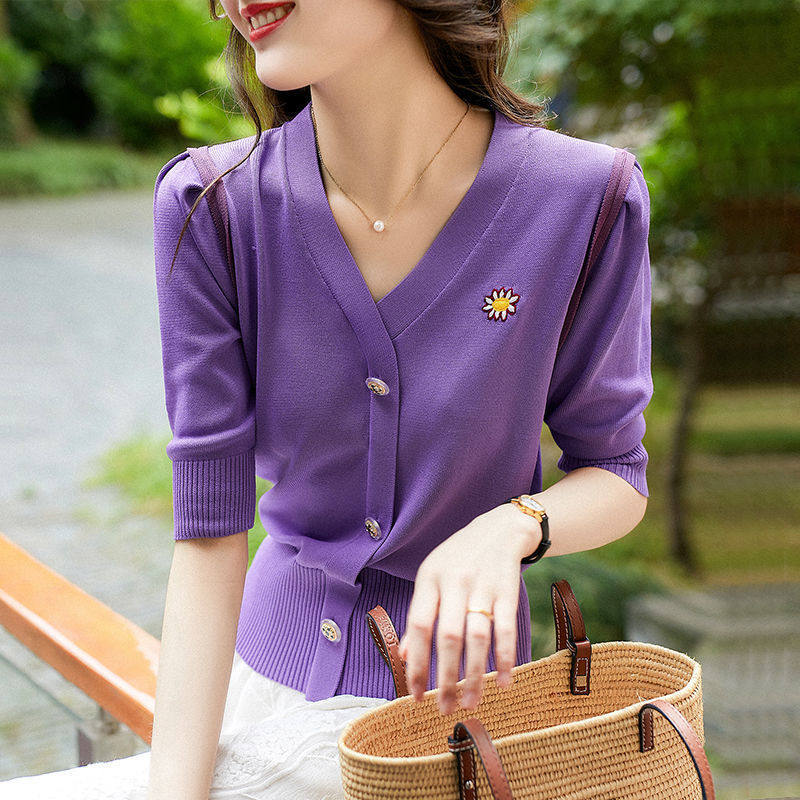 Daisy embroidery bubble mid-sleeved purple knitted cardigan women's 2022 spring and summer new thin section five-quarter-sleeved V-neck top