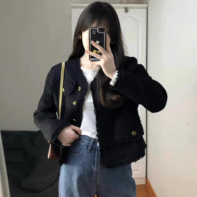 Black small fragrant wind jacket female 2022 autumn and winter new temperament ladies high-end design sense short cardigan top