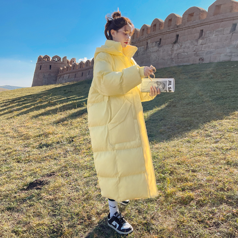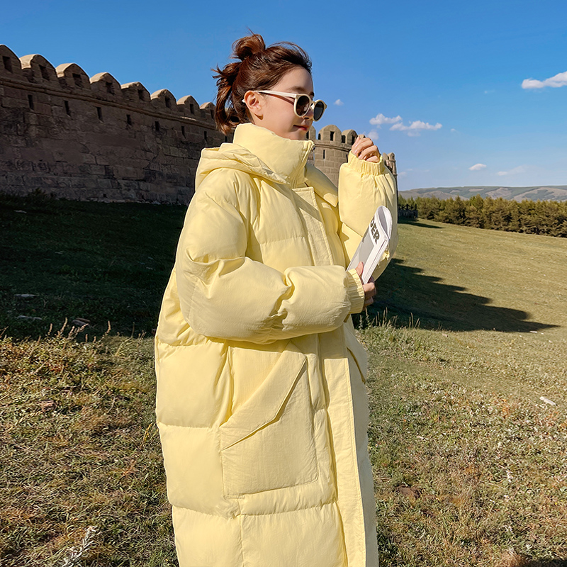 Cream Yellow medium long past knee bread clothes woman Han version with hat 2023 Winter new sweet and down cotton clot jacket-Taobao
