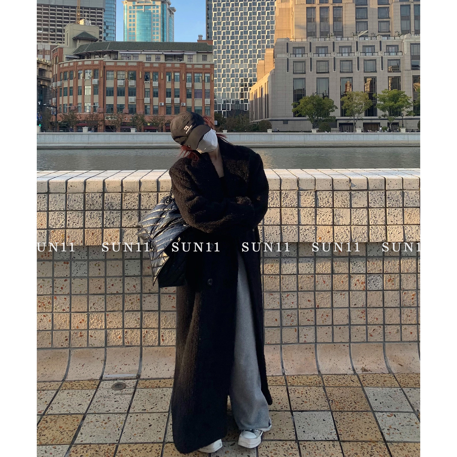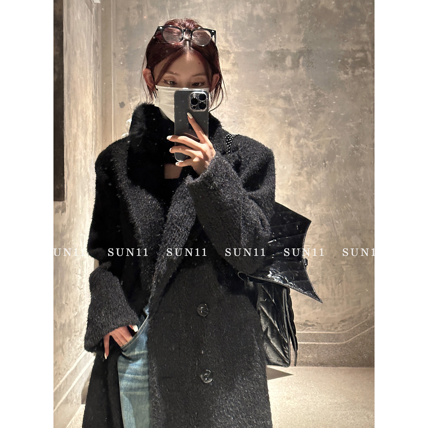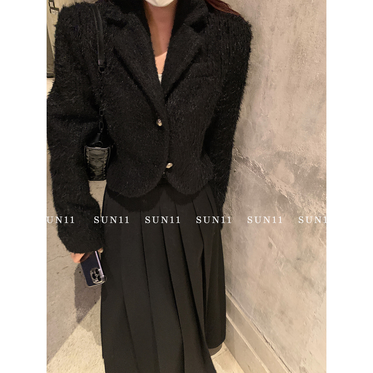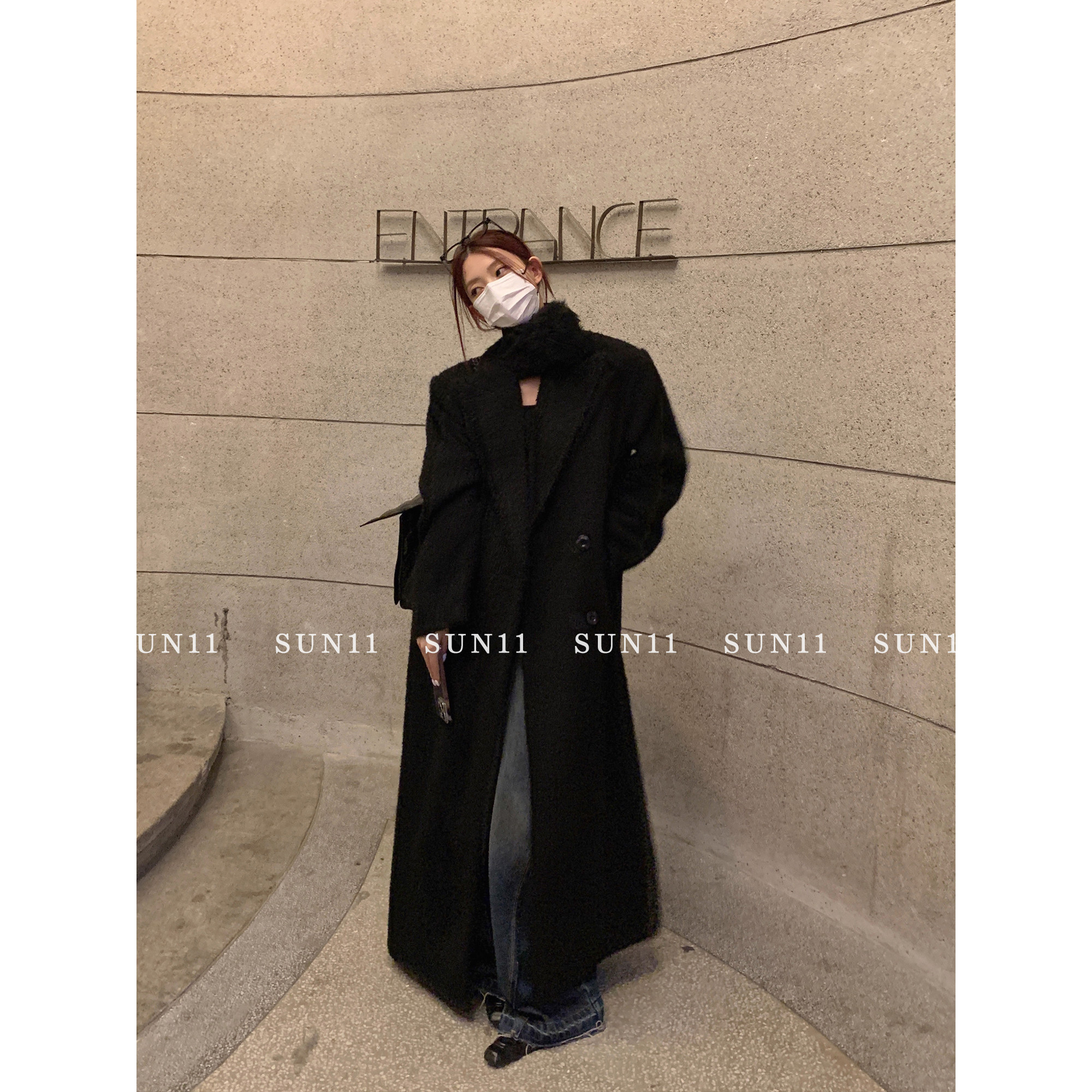 SUN11 black woolen suit coat women's autumn and winter thickened mid-length Korean style loose high-quality woolen coat