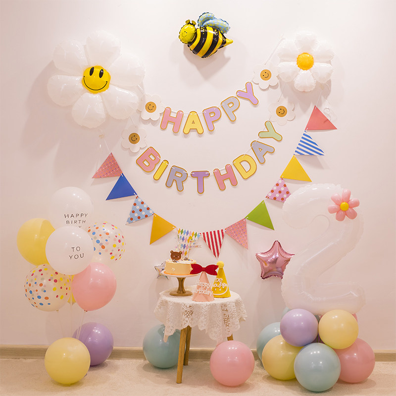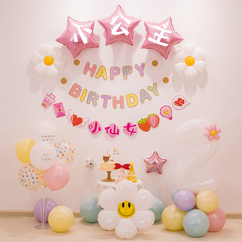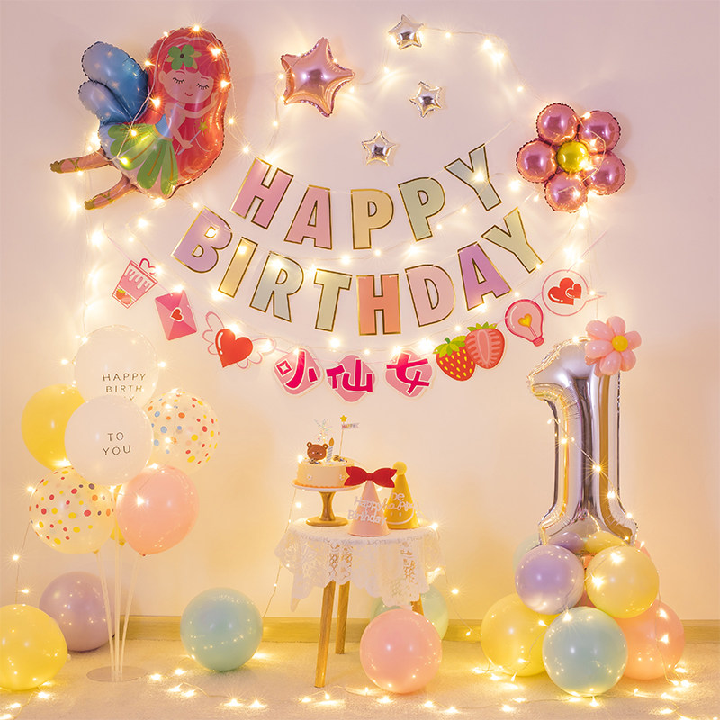 Girl baby girl child 1 year old happy birthday decoration balloon background wall party scene layout supplies
