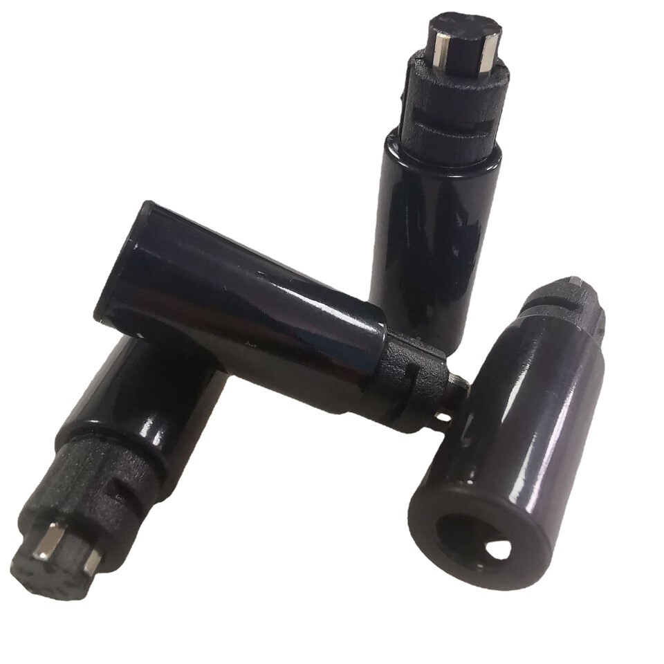 A black shell plug with a silver enclosure plug with a shell-free socket