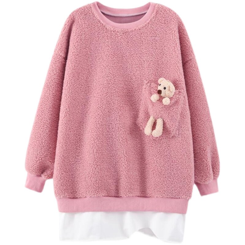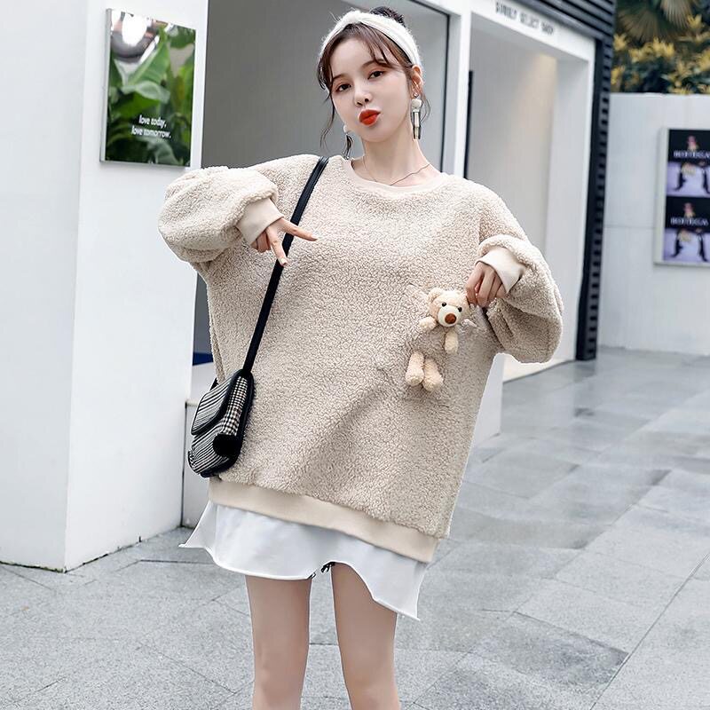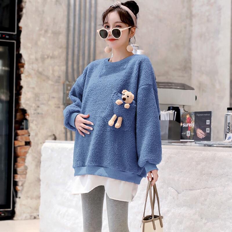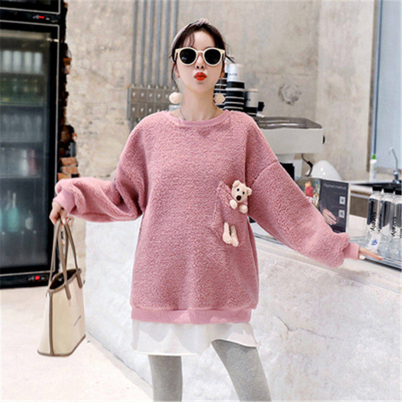 Pregnant woman autumn and winter style lamb suede sweatshirt with long gestation woman dress suit plus suede thickened fake two not explicit blouses-Taobao