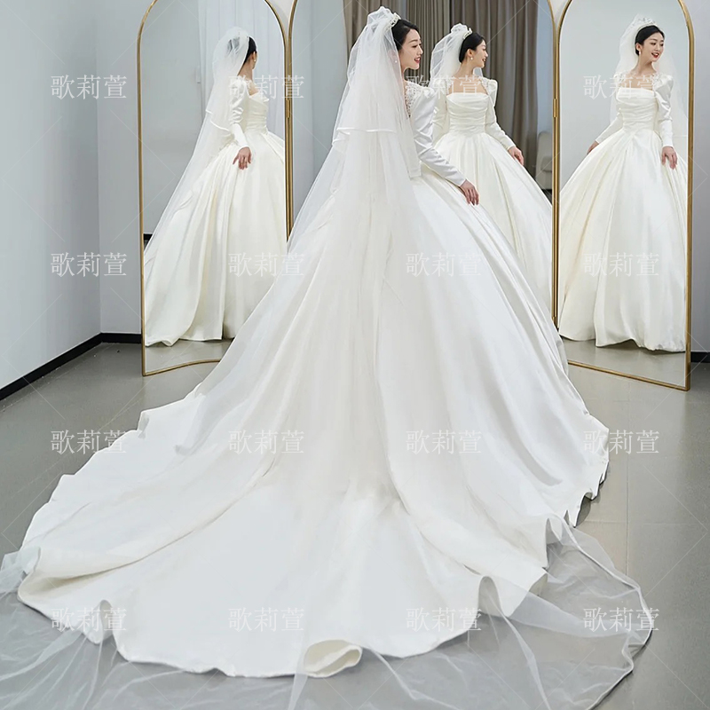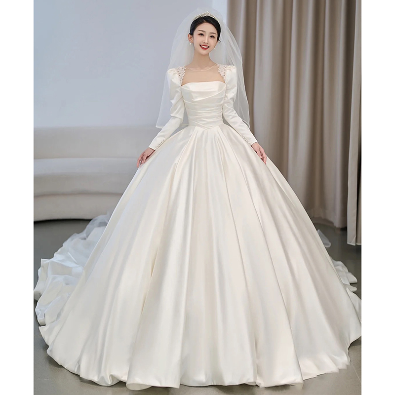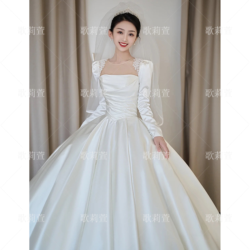 Satin Wedding Dress 2023 New French Bride Small Yarn Heavy Industry Retro Long Sleeve Drag 2022