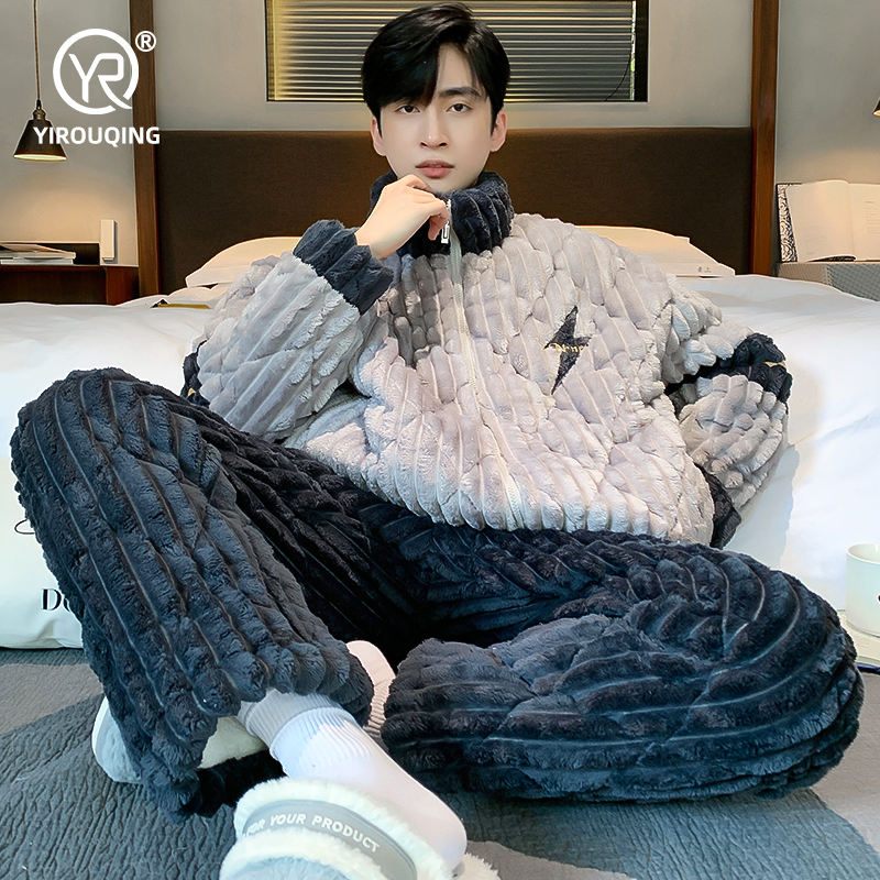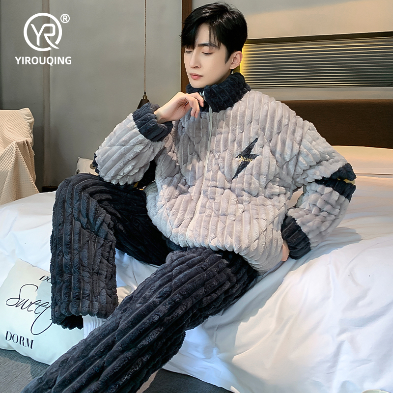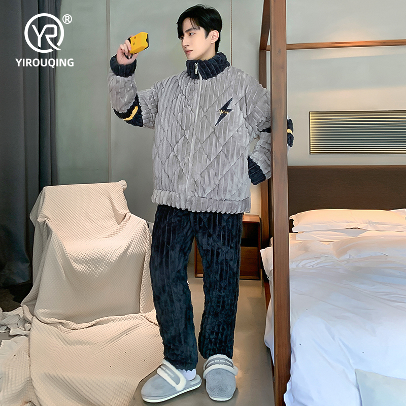 Teen Pyjamas Winter Thicken Plus Suede Coral Suede Triple laminated cotton zipper Winter Warmth Home Clothing-Taobao