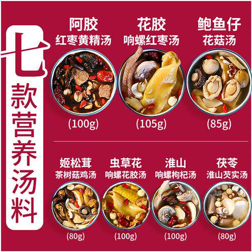 Ejiao Red Date Huangjing Soup 100g Fish Maw Xiangluo Red Date Soup 105g Abalone and Flower Mushroom Soup 85g Cordyceps Flower Xiangluo Huajiao Soup 100g Huaishan Xiangluo Wolfberry Soup 100g Poria, Huaishan Gorgon