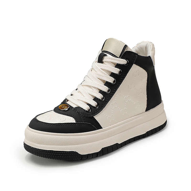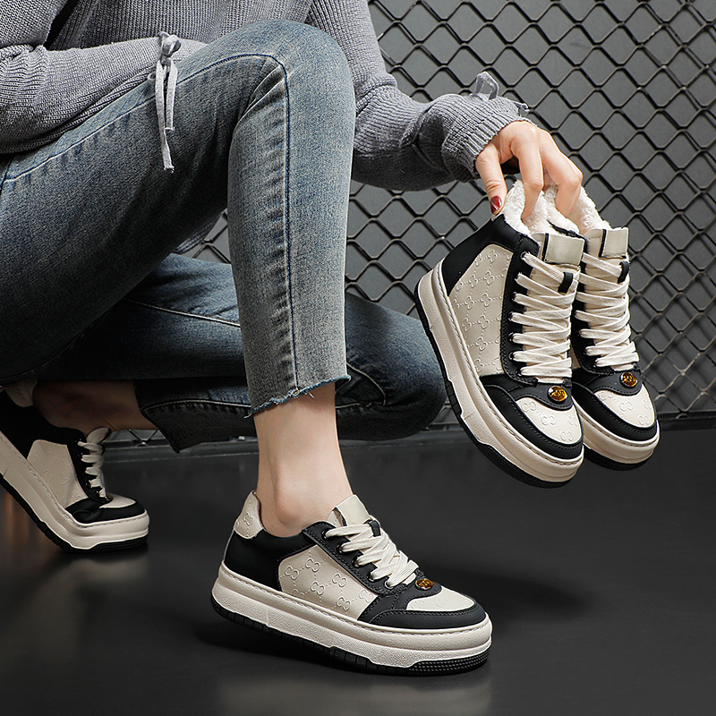 Soft cowhide heightening black and white skate shoes women's thick-soled lace-up casual shoes women's velvet high-top shoes women's winter 2022 new style