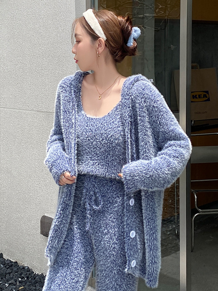 Soft pajamas suit female sensor with long sleeve pants home clothesFall and winter plus thickness knitted three sets