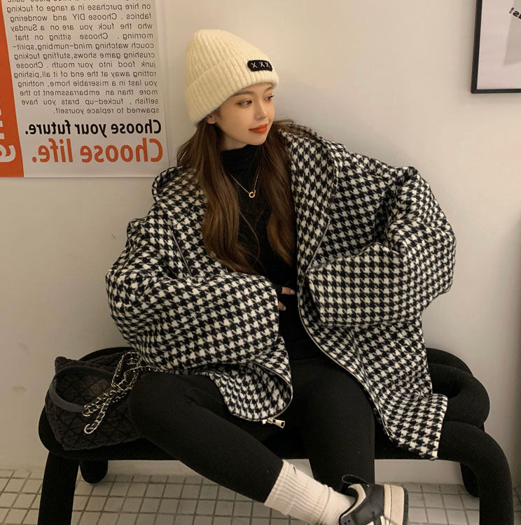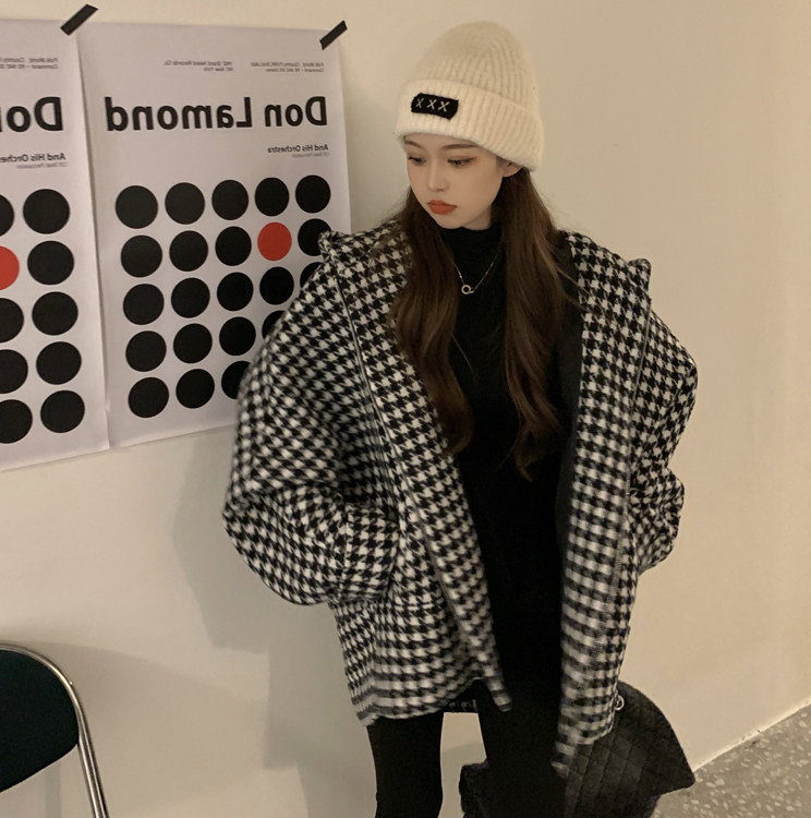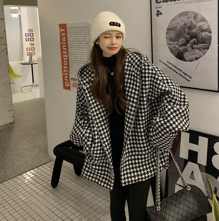 Houndstooth coat women's autumn and winter 2022 new loose, gentle, lazy style, high-level sense, super good-looking hooded cardigan