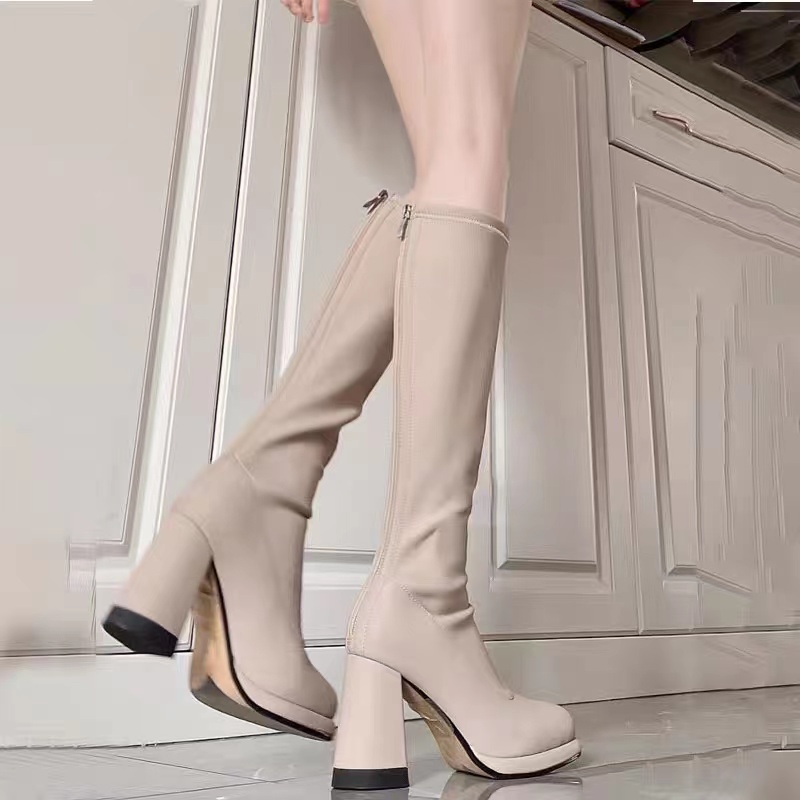 Beautiful super thin milk tea color thin boots temperament chunky heel elastic boots